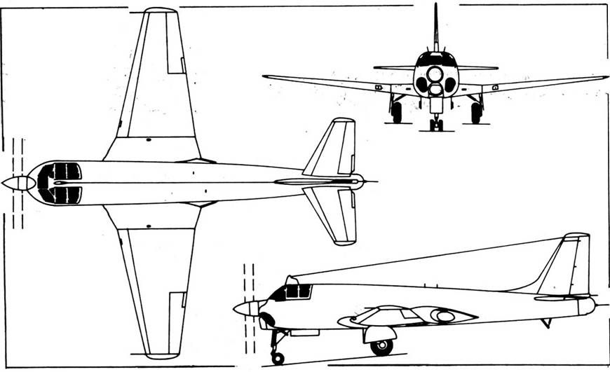 Работы по палубному торпедоносцу-бомбардировщику «509» не вышли из стадии аванпроекта, все внимание заказчика постепенно переключилось на следующий проект ОКБ – самолет «507» (седьмой проект 1950 г.), работы по которому параллельно проводились в бригаде Б. М. Кондроского. Речь шла о проекте палубного торпедоносца-бомбардировщика, штурмовика с одним турбовинтовым двигателем типа ТВ-2Ф (TB-2M) мощностью 6250 э. л. с. Для размещения на авианосце консоли крыла должны были выполняться складными. После предварительных проработок, решения общих вопросов аэродинамической компоновки и расчетов предполагаемых летных характеристик самолет был передан в бригаду С. М. Егера для дальнейшей более детальной проработки и увязки систем оборудования и вооружения. В ходе проектирования в 1952 г. в ОКБ рассматривался проект самолета класса машины «507», но с двигателем ТВД типа ТВ-12 мощностью 12 000 э. л. с. и крылом с углом стреловидности по четвертям хорд 35°. Самолет должен был, по расчетам, выйти на скорости около 1000 км/ч и в какой-то степени стать конкурентом палубному истребителю, закладывавшемуся в ОКБ A. С. Яковлева, сохраняя при этом бомбардировочно- цггурмовые возможности проекта «507». Речь шла о создании универсального палубного самолета типа истребителя -бомбардировщика, способного выполнять широкий круг задач, возлагаемых на палубные самолеты. Габариты и масса подобного самолета должны были быть больше аналогичных, заложенных в проект «507», из-за значительно большей массы силовой установки. Работы по этому самолету не вышли из стадии технического предложения, и в дальнейшем к подобному варианту больше не возвращались. Ведущим конструктором по проекту самолета «91» (именно такое окончательное обозначение по ОКБ получает новая машина) А. Н. Туполев назначил В. А. Чижевского, в прошлом одного из руководителей Бюро особых конструкций (БОК). Ведущими инженерами по самолету были назначены от бригады общих видов – B. И. Богданов, от отдела оборудования – М. Г. Пинегин, от моторного отдела – А. М. Шумов. Неофициально по ОКБ новый проект окрестили «Чиж-Пин-Бог- 15Ш» (первые три части – по фамилиям ведущих конструкторов, цифра 15 – серийное обозначение, следующее за Ту-14, «Ш» – штурмовик). В производство самолет «91» пошел как заказ 194. Все работы по «91» на начальном этапе проектирования самолета консультировал зам. главного конструктора П. О. Сухой, с 1949 по 1953 г. работавший в ОКБ А. Н. Туполева и имевший большой опыт проектирования штурмовиков с поршневыми силовыми установками.
