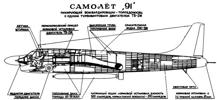 К началу 1953 г. очередной всплеск интереса к авианосцам в СССР пошел на убыль, и авиация ВМФ меняет свои требования к самолету. Теперь речь идет о создании чисто сухопутного боевого летательного аппарата, предназначенного для действий на прибрежных театрах военных действий. 29 апреля 1953 г. вышло Постановление Совета Министров СССР №1138-470, по которому ОКБ А. Н. Туполева поручалось спроектировать и построить пикирующий бомбардировщик-торпедоносец «91». 1 июня 1953 г. командование авиации ВМС выдало ОКБ тактико-технические требования к пикирующему бомбардировщику-торпедоносцу с одним ТВД ТВ-2М. Согласно этим документам самолет «91» предназначался для бомбометания с пикирования по кораблям, военно-морским базам и береговым сооружениям; торпедометания по боевым кораблям и транспортам; как дополнительная задача: штурмовые действия по кораблям, транспортам, высадочным средствам и живой силе десанта, а также бомбометание с горизонтального полета. Самолет «91» должен был выполнять взлеты и посадки днем и ночью и в сложных метеоусловиях с грунтовых аэродромов и аэродромов с ограниченными взлетными полосами. Выполнение боевых задач по нанесению торпедных и бомбовых ударов, а также штурмовых действий должно было осуществляться как одиночными самолетами, так и в составе группы в условиях сильного противодействия зенитной артиллерии противника. Самолет «91» должен был удовлетворять следующим летно-тактическим требованиям: максимальная скорость на высоте 5000-7000 м – 800-830 км/ч; минимальная крейсерская скорость – 300 км/ч; практическая дальность с торпедой 45-36MAB (1000 кг) и 7%-м остатком топлива – 2100 км; практический потолок – 11 000-12 000 м; максимальный угол пикирования – 70*; длина разбега без ускорителей – 450-500 м; длина пробега – 400 м; масса минно-торпедной и бомбовой нагрузки – 1000-1600 кг; экипаж – 2 человека. Наступательное и оборонительное пушечное вооружение оговаривалось: вперед – 2 х 23 мм по 100 снарядов или 2 х 30 мм по 70 снарядов; назад – кормовая подвижная установка 1 х 23 мм с 300 снарядами (углы обстрела – по горизонтали ±45°, вверх +55°, вниз -30°); для контроля за результатами стрельбы – фото кино пулемет ФКП-2. Самолет «91» должен был оборудоваться радиолокационной станцией «Курс» в подвесной гондоле под крылом; системой самолетного радиолокационного ответчика-запросчика («Хром»-«Никель» и «Узел»); аппаратурой зашиты хвоста «Гамма»; радиостанциями типа РСБ-5, РСИУ-3; самолетным переговорным устройством СПУ-ЗР; системой слепой посадки «Материк»; радиовысотомером малых высот РВ-2; автоматическим радиокомпасом АРК-5; аэрофотоаппаратом АФА-БА и другим оборудованием, стандартным для фронтовых самолетов начала 50-х годов. Работы по самолету «91» шли в хорошем темпе, практически без серьезных сбоев и проблем. В сентябре 1953 г. была проведена макетная комиссия по самолету, на которой были решены основные вопросы с заказчиком по компоновке, размещению оборудования и вооружения. Опытный самолет «91» строился на заводе № 156. В апреле 1954 г. самолет был закончен. Осенью «91»-й был перевезен на ЖЛИ и ДБ (Жуковская летно- испытательная и доводочная база) и собран. Началась подготовка к заводским летным испытаниям. Для этого был назначен экипаж: летчик-испытатель Д. В. Зюзин и штурман-испытатель К. И. Малхасян. Руководство осуществлял ведущий инженер по испытаниям Г. В. Гриба