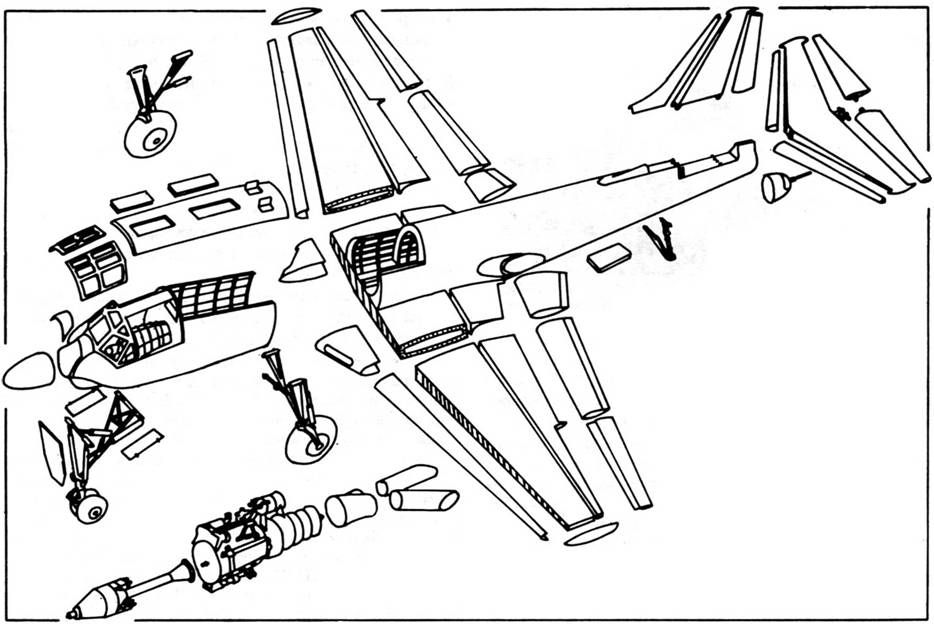 Интересным конструктивным элементом были основные стойки шасси, имевшие рычажную подвеску колес. При уборке ноги не только поворачивались вбок, убираясь в центральную часть крыла, но и поджимались при этом, занимая в убранном положении очень мало места. Учитывая сравнительно небольшие максимальные скорости, для самолета выбрали прямое крыло. Однако для уменьшения вредной интерференции и обеспечения необходимого объема центральной части крыла для размещения в ней шасси ей придали стреловидность по передней кромке 20*. Установка ТВД, малые удельные нагрузки на крыло и хорошие аэродинамические характеристики позволили получить большой эксплуатационный диапазон скоростей, хорошие взлетно-посадочные характеристики, дальность полета 2100-2350 км без наружных подвесок и 1600-1900 км при максимальной боевой нагрузке. Самолет «91» был приспособлен для скоростного пикирования (скорость пикирования 700-750 км/ч) и для заторможенного с помощью воздушных винтов (скорость пикирования 500-550 км/ч). Заторможенное пикирование позволяло применять самолет на очень малых высотах с выходом на бреющий полет. При небольшой взлетной массе и сравнительно малых размерах самолет «91» позволял решать очень важные тактические задачи непосредственной поддержки соединений армии и флота. Конструкция планера Планер самолета – цельнометаллический моноплан с низкорасположенным крылом. Крыло самолета состояло из следующих основных частей: центроплана размахом 2,2 м, имеющего стреловидность в плане по передней кромке 19° 12' 45" и поперечное V=0; двух отъемных частей крыла, имеющих стреловидность в плане 8°1'30" и поперечное V =+5° 23'30". Задняя часть крыла была занята по всему размаху закрылками и элеронами. Закрылки щелевые, выдвигавшиеся назад по дугообразным рельсам. Максимальный угол отклонения закрылков 40 Фюзеляж полумонококовой конструкции. В передней его части располагалась кабина экипажа, устанавливались двигатель, передняя стойка шасси, два топливных бака, масляный бак и всасывающий воздушный канал двигателя, идущий от носка фюзеляжа. В хвостовой части фюзеляжа размещались хвостовое оперение, кормовая дистанционная пушечная установка, выхлопные трубы двигателя, четыре топливных бака и основное оборудование. В конструкцию кабины для защиты экипажа от осколков зенитных снарядов была введена бронеобшив- ка из плит толщиной от 8 до 16 мм из материала АПБА-1. Общая масса брони – 568 кг. В конструкции фюзеляжа широко применялось литье из магниевого сплава МА-5 (каркас фюзеляжа, крышки фонаря и несиловые детали конструкции), а также сплав В-95 и Д16ТНВ. Для установки и демонтажа двигателя сверху фюзеляжа имелся большой люк. В передней части имелись три специальных триплексных стекла в фонаре летчика и два специальных триплексных стекла внизу, справа и слева. Фонарь кабины экипажа выполнялся из органического стекла, кроме вышеуказанных триплексных стекол, с правой и левой откидными крышками. Хвостовое оперение стреловидное. Угол установки стабилизатора можно было менять на земле. Рули высоты и поворота имели осевую компенсацию и триммеры. Система управления самолетом жесткая. Проводка управления рулями высоты и направления двойная. Проводка управления элеронами двойная по фюзеляжу и одинарная по крылу. Триммер правого руля высоты имел тросовое управление и дубл