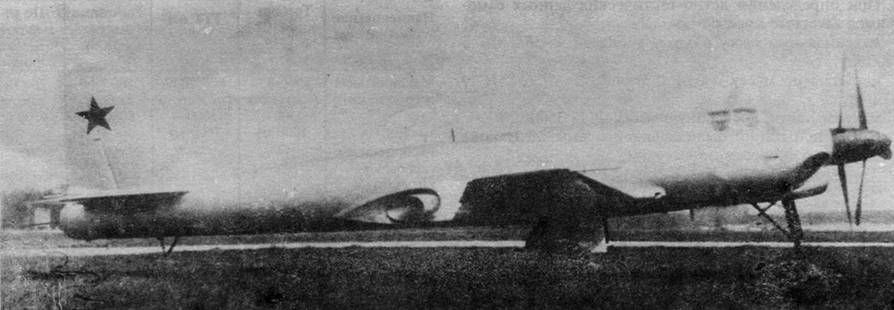 Для контроля результатов бомбометания в хвостовой части фюзеляжа на качающейся установке монтировался аэрофотоаппарат типа АФА-БА/40Р. Самолет оборудовался кислородной системой высокого давления. У летчика и штурмана имелись кислородные приборы типа КП-16 и парашютные приборы типа КП-23. Системы питались от шести баллонов, установленных в хвостовой части фюзеляжа. Передние кромки крыла, оперения и воздухозаборники двигателя имели воздушно-тепловую противообле- денительную систему с отбором горячего воздуха от компрессора двигателя. Передние смотровые стекла летчика и штурмана, а также нижние стекла оборудовались электрообогревом. Лопасти винтов защищались от обледенения жидкостной системой. На переднем смотровом стекле летчика стоял «дворник», на который подавался антифриз. Пушечное вооружение самолета состояло из трех пушек ТКБ-495А (АМ-23). Две пушки для стрельбы вперед устанавливались в консолях крыла, боезапас – 200 снарядов на ствол. Управление огнем и прицеливанием с помощью прицела типа ПБП-6М производил летчик. Одна пушка размещалась в кормовой дистанционной установке с боезапасом 300 снарядов. Управление и прицеливание пушкой осуществлял штурман с помощью перископического прицела ПП-2 и дальномера «Гамма». Бомбардировочное вооружение самолета обеспечивало наружную подвеску бомб различных калибров в нормальном варианте до 1040 кг, в перегрузочном – до 1500 кг. Как уже было сказано выше, помимо бомб предусматривались различные варианты минно-тор- педной нагрузки. Под фюзеляжем по оси самолета на центральной балке подвешивались бомбы ФАБ-1500, Б РАБ-1500, торпеды ТАН, МАН и МАВ, а также мины в габаритах 1500 кг бомбы. Под каждой отъемной частью крыла на пилонах крепились балки в следующих двух вариантах: однозамковые балки для подвески ФАБ-500 или PAT-52, или АМД-500; четырехзамковые балки под четыре бомбы ФАБ-100 или на две ФАБ-250. Балки этих двух вариантов могли подвешиваться под фюзеляж. Бомбометание с горизонтального полета осуществлялось штурманом при помощи векгорно-синхронного прицела типа ОПБ-11Р. Бомбометание с пикирования производилось летчиком, который прицеливался с помощью прицела ПБП-6М. На самолете устанавливалось мощное реактивное вооружение. Одноразовые направляющие для неуправляемых реактивных снарядов соединялись группами и помещались в специальные контейнеры, имевшие обтекаемую форму. Два контейнера подвешивались на пилонах на каждую отъемную часть крыла. При переходе с одного калибра НУ PC на другой производилась замена контейнеров. Варианты загрузки НУРС были описаны выше. Прицеливание и стрельбу реактивными снарядами вел летчик с помощью прицела ПБП-6М. Размах крыла, м 16,4 Площадь крыла, м Длина фюзеляжа, м 15,955 Высота самолета на стоянке, м 5,06 Максимальная взлетная масса, кг 14 700-15 000 Максимальная скорость без подвесок, км/ч . . 800 Практическая дальность на высоте 8000 м, км 2100 Практический потолок, м 11 000-12 000 Длина разбега, м 450-500 Длина пробега при торможении винтом, м . . 450-500 |