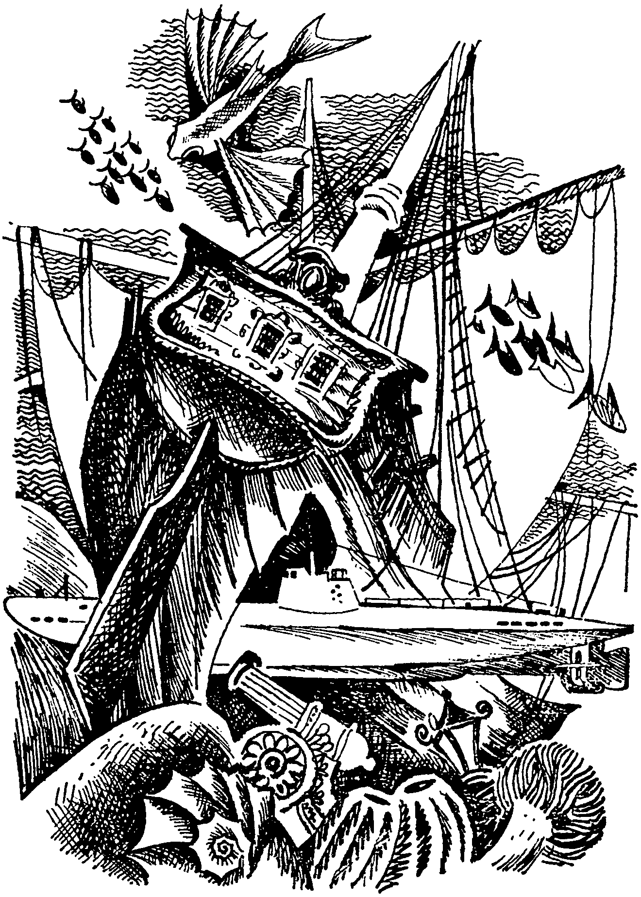 — Да-а, я всё-таки думал о нём лучше… — задумчиво произнёс Дик. — Вы плохо знаете роман Герберта Уэллса, милый Дик, — заметил Артур Грэй. — Когда Гриффину понадобились деньги, он ограбил родного отца. Деньги были чужие, и старик застрелился. — Человек, который погубил родного отца, не задумываясь прирежет любимца Тараскона, — сказал Робинзон не то серьёзно, не то в шутку. — Почему меня, мсье Робинзон? — обиделся Тартарен и на всякий случай вытащил из саквояжа два пистолета. — Конечно, мистер Гриффин — фигура зловещая, но его угрозы нас не остановят, — сказал Артур Грэй. — Не будем терять драгоценного времени. Дик Сэнд горячо поддержал Грэя, и капитаны стали обсуждать план экспедиции в Братск. Им было ясно, что при всех достоинствах «Поморянки», путешествие на ней по порожистой Ангаре было бы весьма затруднительным, да и само появление подводной лодки во внутренних водах Сибири могло привлечь излишнее внимание. Нужен был плот, и капитаны, мысленно перебрав своих соседей по книжной полке, остановились на книге норвежского учёного Тура Хейердала «Путешествие на «Кон-Тики». Кое-кого может взволновать судьба «Поморянки», оставленной без команды в Гвинейском заливе. И совершенно напрасно. Она продолжала покачиваться на волнах, приобретя свой первоначальный вид, — цветной фотографии из журнала «Вокруг света», со страниц которого и была взята для этого удивительного путешествия. А оригинал, с которого был сделан снимок, подлинная «Поморянка» в это время шла по следу огромного косяка сельдей в Баренцевом море.