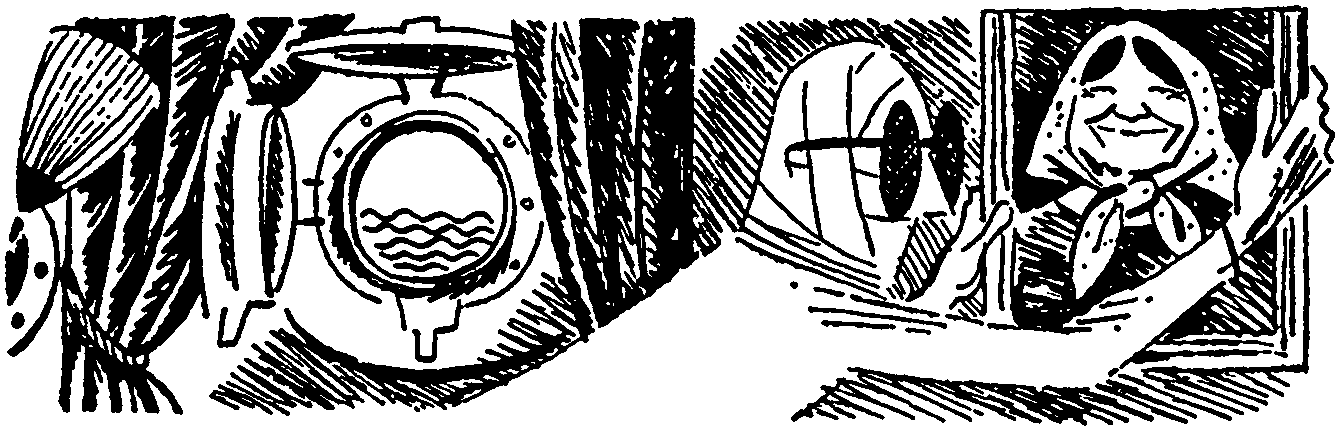 Сквозь смотровые стёкла были видны причудливые колонии кораллов, похожие на подземные сказочные леса. Капитаны как зачарованные глядели то на лиловые, то на зелёные или красные, а порой синие созвездия коралловых цветов. Конечно, это были вовсе не цветы, а полипы. Эти коралловые существа по форме напоминают цветы с шестью или восемью лепестками, но это не благоухающие лепестки, а щупальца, с помощью которых полипы добывают себе пищу. У кораллов меню такое же, как у китов. Те и другие питаются планктоном — микроскопическими инфузориями, рачками, бактериями и тому подобными мельчайшими живыми организмами. Но вот общее внимание привлекла огромная пятнистая мурена, похожая на гигантского угря, длиной около трёх метров, с открытой хищной пастью, наполненной бесчисленным количеством зубов. Вспугнутая появлением подводной лодки, мурена прекратила погоню за многоцветным морским петухом и скрылась в тёмной расселине коралловой постройки. Такого же размера барракуда, удивительно напоминающая щуку, и не подумала спасаться бегством. Она кинулась в атаку, пытаясь с ходу разбить смотровое стекло. — Бр-р… не хотел бы я встретиться с этой крошкой лицом к лицу, — сказал Тартарен, отшатнувшись от окна. — Взгляните на эти ужасные зубы. Даже мурена мне кажется несколько симпатичнее. — Едва ли это так, — поправил его капитан Немо. — Барракуда не знает страха и дьявольски энергична. Однако мурена гораздо опаснее. Известно множество случаев, когда мурена стаскивала людей со шлюпок и нападала на водолазов. Пасть этого хищника никогда не закрывается. Слишком уж много у неё зубов. И, кроме того, укус мурены ядовит. Она ищет добычу не только в тропических водах, но встречается в Средиземном море и даже у южных берегов Англии. — Выходит, мурены опаснее акул? — с некоторым сомнением заметил Дик Сэнд. — Те и другие хороши, — вмешался Робинзон. — Не позавидую тому, кто повстречается с белой акулой, метров двенадцати длиной, так называемой акулой-людоедом. Представьте себе, у неё несколько сот зубов, по четыре сантиметра каждый. — Не знаю, как было с вами, — самонадеянно заявил Тартарен. — Меня акула не пробовала. Но я её ел! Суп из акульих плавников! Пальчики оближешь. А мясо? Если не знать, что это кусок акулы, можно подумать — какая прекрасная осетрина! Но скажу честно — акульей икрой никогда не лакомился. Капитан корвета усмехнулся и не без иронии пояснил:. — И никто не лакомился, дорогой Тартарен. Акула икры не мечет. У неё родятся живые акулята. Гулливер не принимал участия в этом разговоре. Его внимание было целиком приковано к картам и приборам. Наконец, оторвавшись от экрана радиолокатора, он торжественно произнёс: — Достопочтенный капитан Немо, мы находимся на траверзе порта Такоради. Цель нашего путешествия близка. — Прожекторы гасить! Готовиться к всплытию! Продуть цистерны! — скомандовал капитан «Наутилуса», нашумевшего на страницах романа «Восемьдесят тысяч километров под водой», но, к сожалению, несколько устаревшего за последнее время. Не секрет, что подводная лодка «Поморянка» обладала многими примечательными достоинствами, которые не предвидела фантазия Жюля Верна. На «Поморянке» была аппаратура, дающая возможность вести наблюдение как под водой, так и на её поверхности, чувствительные гидрофоны, улавливающие самые слабые звуки, и мног