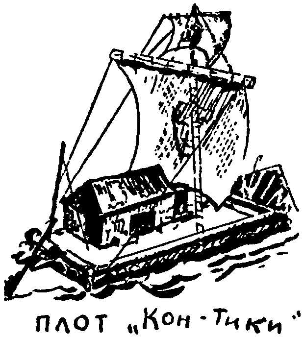 По живописной реке, несущей свои могучие воды посреди сибирской тайги, медленно плыл плот «Кон-Тики». Свежий ветер надувал четырёхугольный парус с изображением древнего перуанского вождя — сына солнца Кон-Тики. Несколько странно было смотреть на этот плот в наше время, но казалось, что загадочные глаза Кон-Тики были удивлены не меньше, разглядывая прибрежную тайгу. А посмотреть было на что. От одного берега Ангары до другого — добрый километр. Множество зелёных островков плыли навстречу плоту. Вековые лиственницы, гигантские кедры и корабельные сосны тянулись к облакам. Капитан корвета постучал молотком по рулевому веслу. — Заседание Клуба знаменитых капитанов продолжается. Дик! Прошу записать в вахтенный журнал. Плывём по Ангаре. Курс — город Братск. Цель — поиски клада. Ветер попутный. Скорость — пять узлов. Происшествий нет. — Рыбы тоже нет! — огорчённо заметил Тартарен, вытаскивая из воды удочку с пустым крючком. — Но есть вопрос. Зачем норвежские юноши отправились на этом корабле… пардон, на этом плоту через Тихий океан? — Видите ли, дорогой Тартарен, — ответил председатель клуба, — среди обитателей острова Пасхи сохранились предания, что их предки поселились там более тысячи лет назад. Но откуда они прибыли, каким путём? Молодой норвежец Хейердал высказал предположение, что они приплыли из Южной Америки. — Разрешите усомниться в теории этого достоуважаемого учёного. Как же предки нынешних полинезийцев могли переплыть океан? — удивился Гулливер. — На чём? — поддержал его пятнадцатилетний капитан. — Вот на таких плотах, — сказал Артур Грэй, указывая на решётчатую палубу «Кон-Тики». — Это миф! — возразил Немо. — Сказка! — поддакнул Тартарен, снова забрасывая в воду удочку. — Легенда! — заметил Гулливер. — На таком плоту пересечь Тихий океан? — с сомнением промолвил Дик Сэнд. — Нет, это невозможно! — Этот миф, сказка, легенда стали действительностью, — улыбнулся Артур Грэй. — Шестёрка отважных парней во главе с Хейердалом построила этот плот из бальзового дерева. Оно растёт главным образом в Центральной Америке и на Антильских островах. Если это дерево высушить, оно становится вдвое легче пробки. Посмотрите сами — плот построен по древнему индейскому образцу, без гвоздей и стальных тросов. — Значит, это немагнитный плот, так сказать, прадедушка «Зари», — оживился Тартарен. — Если хотите, да. Но у «Кон-Тики» были другие цели, — улыбнулся Артур Грэй. — Так вот, смельчаков провожали из перуанского порта Кальяно как обречённых на гибель. Однако через сто дней, пройдя по океану около восьми тысяч километров, они высадились на одном из полинезийских островов. — Значит, Хейердалу удалось доказать свою теорию о заселении Полинезии южноамериканскими индейцами! — изумлённо произнёс Дик. — Нет, — возразил капитан корвета. — Наука доказывает другое: родство народов Полинезии и Индонезии, сходство языков и памятников их древней культуры. — Следовательно, Хейердал ошибался, — сделал вывод Гулливер. Немо расхаживал по плоту, поглядывая на изображение перуанского вождя Кон-Тики. — Да, Хейердал не разгадал тайны острова Пасхи. Но его плавание на плоту «Кон-Тики» — одно из самых дерзких и примечательных путешествий последнего времени. Свежий ветер надувал четырёхугольный парус. Нарисованное на холсте изображение божественног