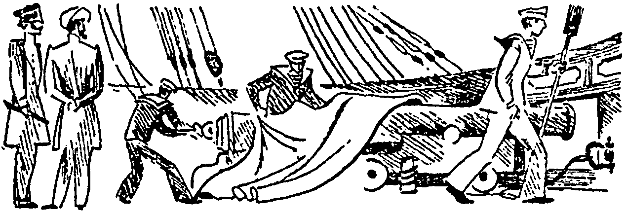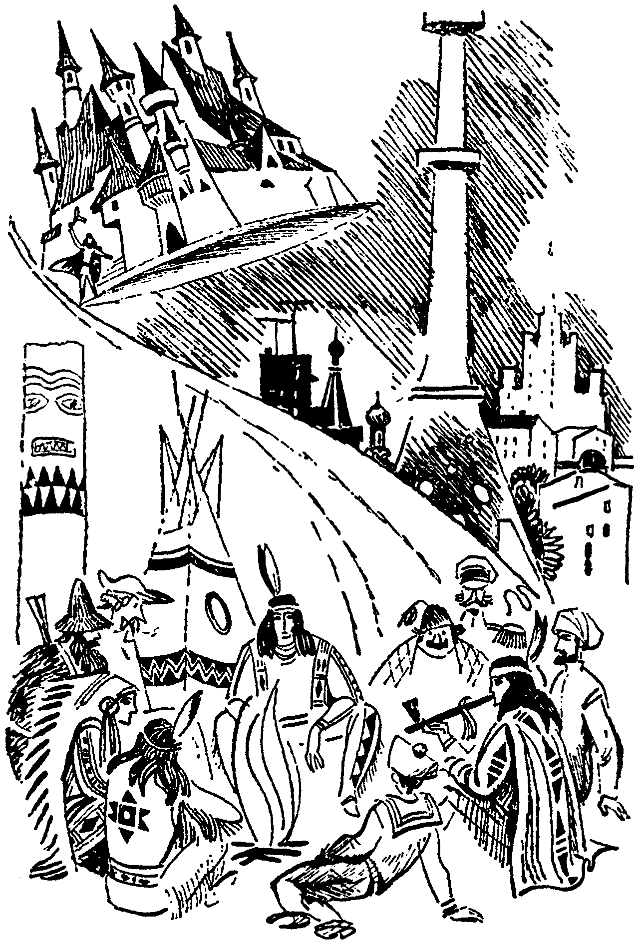 В проломе крепостной стены, пробитой ядрами, показались волчьи и медвежьи пасти. Это были индейцы в своих боевых масках. Соблюдая осторожность, стараясь быть незамеченными, они поползли вниз и скрылись в густом кустарнике. Предательский треск сухих сучьев под ногами и шум листвы останавливал индейцев, но ненадолго. Видимо, они торопились. Трудно было сказать, спасались ли они бегством или же спешили куда-то. Но по тому, как они тщательно искали укрытия за каждым кустом и деревом, можно было предположить, что они опасались нападения, а возможно было и другое: им было поручено устроить засаду на береговой тропе. Уже виден был берег. Пенился прибой. Индейцы, крадучись, перебежали дорогу. Их силуэты промелькнули за рыбацкими сетями, прозвеневшими грузилами. Солнце уже закатилось за океан, и начинался ночной бриз-ветер с суши на воду. «Отваливай!..» — негромко раздалась команда. И когда шлюпка носом разрезала волну, рулевой крикнул: — Правая табань! Левая на воду! Рулевой оглянулся назад. Берег уплывал. — Ну, теперь можно снимать маски! — прозвенел знакомый мальчишеский голос «Пятнадцатилетнего капитана». Быстро были сброшены боевые маски индейцев-тлинкитов. У руля был капитан корвета «Коршун». На вёслах — Робинзон Крузо, Немо, Артур Грэй и Гулливер. Дик Сэнд расположился на деревянной решётке люка у носа шлюпки. — Сейчас мы обогнём мыс, — сказал капитан корвета, — и подойдём к «Коршуну». Левая табань!.. Правая на воду! Навались! — скомандовал он своим друзьям. По береговой тропе брели связанные Тартарен и Мюнхаузен под конвоем индейцев. Влажный воздух, пропитанный солью и хвоей, кружил голову любимцу Тараскона, еле передвигавшему ноги. В его вишнёвых глазах не было обычного блеска, азартного огонька. Потухший взор вяло скользил по океану. Вдруг он прошептал: — «Коршун»!.. Мюнхаузен безразлично поглядел на небо, — У вас галлюцинация, мой друг. Но Тартарен твердил: — «Коршун»!.. Корвет «Коршун»! Мюнхаузен даже не успел взглянуть на море… Индейцы схватили его и отчаянно барахтавшегося толстяка… Из-за мыса показалась шлюпка со знаменитыми капитанами. Седой Бобёр и Чёрный Медведь взялись за ружья. Тартарен заорал: — Эй! На шлюпке! — Эй! На корвете «Коршун»! — крикнул Мюнхаузен. Второй раз крикнуть им не удалось, так как на них навалились индейцы… — Мне показалось, что с берега кричали, — сказал Немо. — Я даже слышал, — взволнованно произнёс Дик, — «Эй! На корвете…» — Как будто кто-то взывал о помощи, — заметил Артур Грэй. — Повернём к берегу, — скомандовал капитан корвета. Седой Бобёр и Чёрный Медведь, увидев, что шлюпка быстро направилась к берегу, взяли капитанов на прицел. Из-за кустов заблестели дула мушкетов. Шлюпка пристала к берегу. Связанные Тартарен и Мюнхаузен лежали на земле, пытаясь освободиться от верёвок. Здоровенные кляпы были обоим забиты в рот. — Это люди с пиратского брига, — прошептал Чёрный Медведь. — Вглядись получше, — ответил Седой Бобёр. — Я вижу русского начальника в морской форме. Неужели ты не узнаёшь бородатого в козьей шкуре?! Они были с нами во время сражения с людьми Барбера. — Я узнаю их, Седой Бобёр. Вот этот мальчик, — сказал Чёрный Медведь, указав на Дика Сэнда, — бежал рядом со мной, когда мы ворвались в крепость. — Воины Ворона! — крикнул Седой Бобёр. — С почестями принять гостей! Это наши друзья! Седой Бобёр 