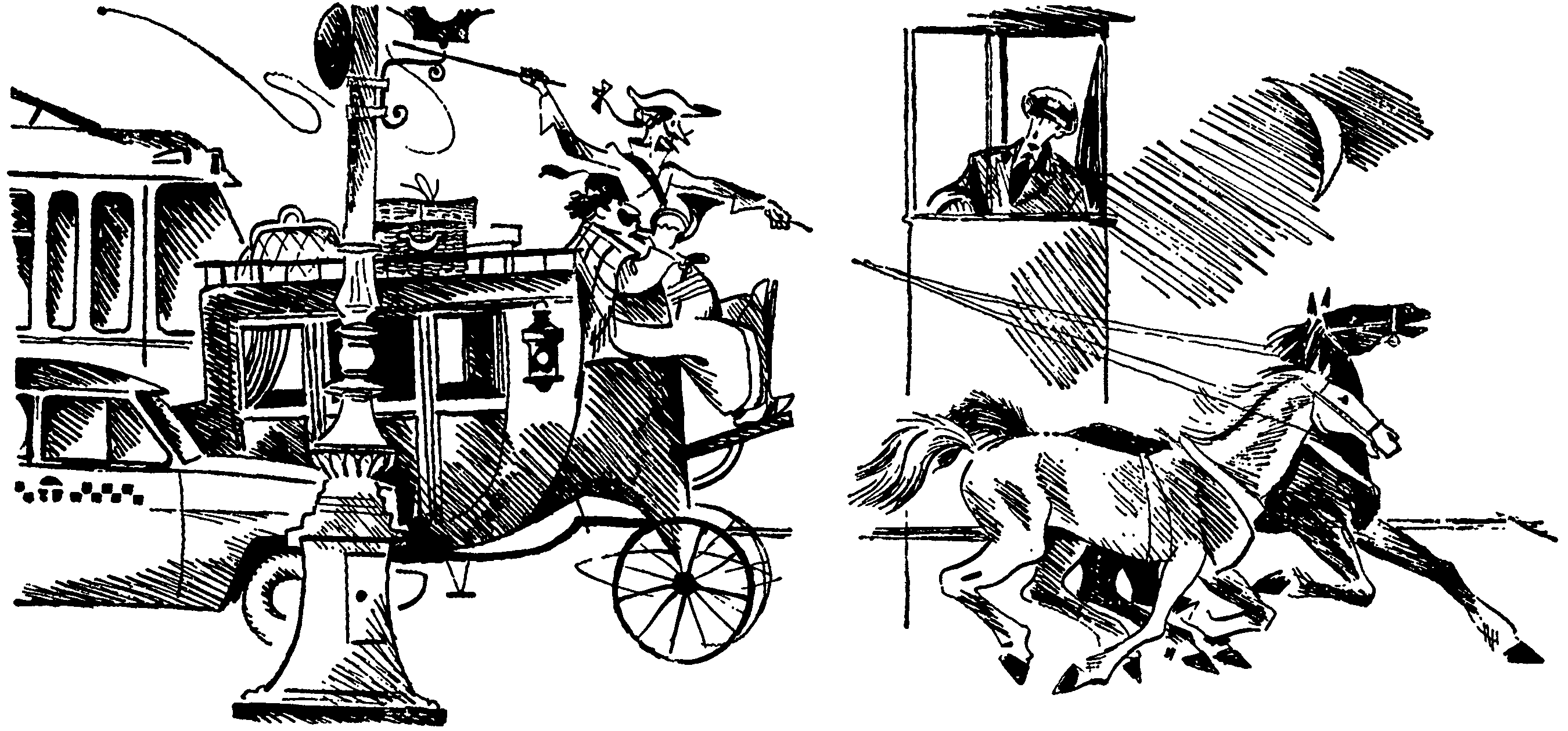 Артур Грэй, задумчиво поглядев в иллюминатор, беззвучно прошептал: — Барбер?! — и, внезапно обернувшись к друзьям, воскликнул — Вспомнил, капитаны… в одном из старых морских журналов я читал, что пират Барбер на бриге «Юникорн» появился в гавани Ново-Архангельска в 1802 году. — Не собьёмся ли мы в тумане с курса? — спросил Гулливер. — Я проверял. Мы идём строго по курсу к острову Ситха, — ответил капитан корвета. — Вернее, к острову Баранова, — поправил Артур Грэй. — Ещё при жизни правителя острову Ситха было присвоено его имя. — Вы не тревожьтесь раньше времени, Гулливер, — успокаивал его капитан корвета. — Мы настигнем пиратский бриг. Ваше мнение, Грэй? Артур Грэй ничего не ответил на его вопрос, а продолжил разговор, начатый у иллюминатора… — «Моряк искусный, но человек недобрый…» — так говорили на Аляске о Барбере в те времена. Дик Сэнд с досадой отозвался: — Жаль, что Клуб знаменитых капитанов не в полном сборе. Где сейчас Мюнхаузен? Куда исчез Тартарен? Да-а, его коллекция оружия могла бы нам пригодиться при свидании с королевским корсаром. — Особенно в абордажной схватке! — добавил Артур Грэй. — Пойду распоряжусь, — сказал капитан корвета, направившись к двери. — Надо на всякий случай снять «куртки» с пушек. Так называли просмолённые парусиновые чехлы, прикрывающие чугунные жерла. — Это предусмотрительно, — одобрительно произнёс Немо. — В тумане пиратский бриг может совершенно неожиданно появиться у самого борта. Нетрудно себе представить, что произойдёт, если мы не успеем дать бортовой залп и наши пушки будут молчать! Раскатистый голос старшего помощника капитана гремел на палубе, прошумел над «вороньим гнездом» марсового матроса, налетал на снасти и паруса и даже глухо отзывался в трюме. — Поставить брамсели и бом-брамсели!.. Убрать стаксель!.. Подобрать гика-шкот!.. Вскоре корвет «Коршун» исчез в тумане. Но долго ещё восточный ветер, славившийся своим коварством, доносил гулкий бой судового колокола и пронзительный рёв корабельной сирены. Тёплая августовская ночь. Над Москвой поднималась Луна. И редко кто из прохожих смотрел на клоунский лик вечного спутника Земли, хотя в этот час в районе Моря Дождей медленно двигался советский луноход… К этому «чуду» уже привыкли и со дня на день ждали нового и более невероятного сообщения, поглядывая на Марс, ярко мерцавший красноватым блеском. В эту ночь — десятого августа 1971 года — Марс был в великом противостоянии с Солнцем и находился на самом близком расстоянии от Земли. Но, пожалуй, больше всего удивило редких пешеходов другое явление. Мимо Курского вокзала промчался старинный почтовый дилижанс. Четвёрка лошадей как вихрь пронеслась по мостовой, обогнав такси. Ведь лошади уже давно исчезли с московских улиц. Их можно было увидеть только на бегах и на манеже цирка. А тут — четвёрка коней, запряжённых в почтовый дилижанс! Да ещё с ряжеными на козлах! «Киносъёмка… — подумал постовой милиционер и, улыбаясь, прикинул в уме: — Что же это может быть за картина? Историческая, наверно…» Домыслы сержанта милиции не оправдались. На этот раз это была не киносъёмка. На козлах сидело двое — Карл Фридрих Иероним Мюнхаузен с длинным бичом в руке, а рядом — знаменитый охотник за фуражками и гроза львов — Тартарен из Тараскона. — Гоните прямо в нашу кают-компанию, Карл Фридрих Иероним. — Да г