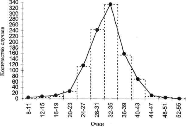 В качестве последней иллюстрации рассмотрим рисунок 10, содержащий распределение результатов широко используемого личностного опросника. График показывает распределение 600 учениц колледжа по результатам теста Оллпорта на доминирование-подчинение. Целью этого личностного опросника было исследование стремления индивида доминировать над другими членами группы в повседневной жизни или подчиняться им. Рисунок 10 показывает, что, несмотря на биполярное определение качества (противопоставление доминирования и подчинения), большинство результатов испытуемых располагаются вокруг середины шкалы и распределение приближается к нормальному. Иными словами, биполярное наименование качества не должно вводить нас в заблуждение, что индивидов можно классифицировать на доминирующих и подчиняющихся. Как и другие измеряемые свойства человека, данное личностное качество имеет множество степеней проявления; и при этом большинство людей относятся к промежуточным типам.