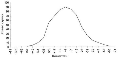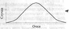 Мы можем продолжить описание группы, определив ее центральную тенденцию. Если мы захотим получить наиболее типичное значение, которое характеризовало бы группу в целом, то необходимо определение главной тенденции. Одним из наиболее известных способов является вычисление средней величины, получаемой при сложении всех показателей и делении полученной суммы на число случаев. Такая величина называется средним арифметическим. Другим способом определения главной тенденции, часто используемым в психологии, является медианный. Если все результирующие значения расположить по порядку в соответствии со своей величиной, то медианой будет результат, расположенный ровно посередине ряда. Для больших групп гораздо легче вычислить медиану непосредственно на основе частотного распределения. В этом случае медианная точка разделяет распределяемое множество таким образом, что половина случаев будет находиться выше нее, а другая половина — ниже. Еще одним способом измерения главной тенденции, иногда встречающимся в психологических исследованиях, является определение моды, или наиболее часто встречающегося показателя. Его так же можно найти на основе частотного распределения, выявив ту точку интервала, которая имеет самую большую частоту. Заметим, что мода соответствует самой высокой точке графика. Для распределения, данного в таблице 1 и на рисунке 2, среднеарифметическое значение составляет 32,37, медианное — 32,46 и значение моды — 33,5. Читатель наверняка уже обратил внимание на особенности распределения, представленного в таблице 1 и на рисунке 2. Большинство случаев расположены в центре ряда, а приближаясь к крайним значениям, происходит долгий плавный спад. На графике нет разрывов — нет классов, которые были бы отделены друг от друга. Кроме этого, график по обе стороны симметричен; это означает, что если его разделить вертикальной линией по центру, то получившиеся две половинки окажутся примерно одинаковыми. Такой график распределения своей формой похож на колокол, это так называемое «нормальное распределение», которое чаще всего встречается при измерениях индивидуальных различий. В своем идеальном виде нормальное распределение изображено на рисунке 3. Понятие нормального распределения в статистике используется уже давно. Вероятность какого-либо события представляет собой частоту его наступления, зафиксированного очень большим количеством наблюдений. Эта вероятность представляет собой определенное соотношение, точнее, дробь, числителем которой является ожидаемый результат, а знаменателем — все возможные результаты. Таким образом, вероятность, или шансы, того, что две монеты выпадут одной и той же стороной, например решкой, будет один к четырем, или 1/4. Это следует из того факта, что существует всего четыре возможные комбинации выпадения монет РР, РО, ОР, ОО, где Р — решка, а О — орел. Одна из четырех, РР, означает выпадение только решек. Вероятность выпадения двух орлов будет также составлять 1/4, а вероятность выпадения решки какой-либо одной монеты при выпадении орла другой составит один к двум, или 1/2. Даже если число монет увеличить, скажем, до 100, и количество возможных комбинаций станет очень большим, то мы по-прежнему сможем математически определить вероятность возникновения каждой комбинации, например, выпадения всех
