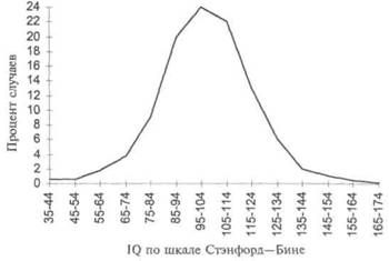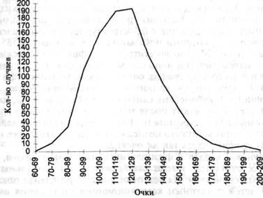 Если продлить время нашего наблюдения за 59 водителями до 13-месячного периода, мы получим распределение, показанное на графике 20Е. Хотя на нем представлено несколько незначительных отклонений, данное распределение, естественно, не является J-кривой, его пик приходится приблизительно на центр ряда значений. С удлинением периода наблюдения общее число аварий в нашей выборке из 59 человек увеличивается, и, следовательно, распределение становится все менее скошенным. Последней иллюстрацией специальных факторов, которые могут повлиять на форму графика распределения, являются Наиболее достоверным объяснением такого отклонения от нормы является ссылка на вторичные факторы, такие как заболевания, ненормальные условия жизни или большее число, по сравнению с ожидаемым, доли слабоумных детей (ср., например, 22). Напомним, что нормальное распределение получается тогда, когда измерение некоей переменной представляет собой совокупный результат очень большого числа измерений независимых и в равной степени значимых факторов. Рассматривая чрезвычайно большое число как наследственных факторов, так и факторов среды, влияющих на развитие умственных способностей в общей популяции, разумно ожидать распределения IQ в соответствии с нормальным графиком. Некоторые формы умственной отсталости, такие как дебильность, появляются, скорее в результате действия какого-либо единичного фактора, чем множественных факторов. Иными словами, некоторые патологические условия, развивающиеся под воздействием наследственности и среды, при прочих равных обстоятельствах могут быть непосредственной причиной возрастания числа случаев умственной отсталости. Поэтому на отрезке низких значений графика распределения эти единичные факторы суммируются с множественными факторами, вероятными при нормальном распределении. Попутно дополним, что имеющиеся данные по отрезку низких значений графика распределения интеллектуального уровня, так же как и интерпретация этих данных, носят пока в основном предварительный характер. Мы привели их здесь лишь для того, чтобы проиллюстрировать возможные следствия действия патологических условий, «наложенных» на форму графика распределения. Подытожим сказанное: если мы исходим из ожидания, что графики распределений будут в целом похожи на нормальный график, любое отклонение от нормы становится проблемой для исследования. Такой подход к форме распределения весьма плодотворен для раскрытия механизма действия различных факторов. Например, существенное отклонение от нормы может означать, что высшие значения теста занижены, а его нулевая отметка завышена или что вопросы теста не соответствуют отрезку определенной сложности. Кроме этого, могут стать очевидными некоторые факторы, которые до недавнего времени скрыто воздействовали на изучаемую выборку. И наконец, форма полученного распределения может послужить ключом к раскрытию того существенного влияния, которое вместе с изменением графика распределения изменяет само качество. Иными словами, любое существенное отклонение от нормы должно настораживать исследователя и побуждать его к дальнейшим исследованиям. Кроме вопроса, связанного с формой графика распределения, встает вопрос о степени различий между индивидами. Насколько велики индивидуальные различия? О