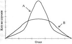 Очки Было бы неправильным на основании рассмотренных выше примеров сделать вывод о том, что все распределения, полученные дифференциальной психологией, соответствуют нормальному. Существует много других возможных типов частотных распределений, некоторые из них можно проиллюстрировать на примере реальных данных, полученных при исследовании некоторых качеств. Графики распределения могут отличаться от математической «нормальности», главным образом, асимметричной (скошенной набок) формой и степенью уплощенности. Кроме этого, отклонения от нормального распределения могут проявляться в некоторой На рисунке 12 изображены два графика, один из которых более заострен, а другой — более уплощен, чем теоретический нормальный график. В первом из них (график А) наблюдается чрезмерный рост количества случаев в центре с одновременным уменьшением их количества у крайних значений шкалы. Во втором (график В) случаи распределены более равномерно на протяжении длинного отрезка.