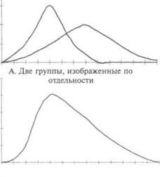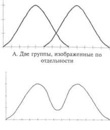 Графики распределений, существенно отличающиеся от нормальных и проявляющих одну или несколько характеристик, описанных выше, появляются время от времени при наличии некоторых условий. Знание этих условий необходимо для правильной интерпретации частотных распределений. Главными факторами, которые могут оказать влияние на форму графика распределения, являются: неадекватность выборки, использование неудачных или непригодных средств измерения и некоторые факторы, воздействующие непосредственно на исследуемое качество. Сейчас мы рассмотрим по порядку каждое из этих условий. Выборка. Чтобы получить любой заданный тип распределения, достаточно просто специально подобрать испытуемых, соответствующих этому типу. Естественно, такая процедура не будет объективной. Подобная изменчивость может быть результатом действия факторов отбора, на которые исследователь не всегда обращает внимание. Каждый раз, когда график распределения существенно отличается от нормального, встает вопрос об адекватности выборки. Например, скошенность может быть результатом включения в состав единого распределения двух нормально распределенных групп, имеющих выраженные отличия друг от друга по значению. Иллюстрацией такого эффекта может быть рисунок 13. В варианте А даны отдельные графики распределения по двум группам, у одной из которых более низкое среднеарифметическое значение и меньше разброс результатов, чем у другой. В варианте В график имеет скошенный вид, который получился в результате объединения графиков распределения двух групп в общий график распределения.