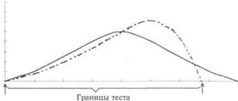 Б. Две соединенные группы Мультимодный график также получается тогда, когда тестируемая выборка не является случайной по отношению к общей популяции, но состоит из индивидов, отобранных с разных уровней и объединенных в единую группу. Например, группа, состоящая из 5- и 10-летних детей, будет непременно давать бимодальное распределение как по показателям теста на умственные способности, так и по результатам измерения роста, веса и многих других характеристик. Если бы в эту выборку были включены группы детей от 6 до 9 лет, то распределение имело бы вид нормального, колоколообразной формы графика. Как получаются бимодальные распределения в результате подобного объединения двух сильно различающихся групп, видно на рисунке 14. Легко заметить, что у них мало общих точек. Когда их много, как в случае с близкими возрастными группами, результирующий объединенный график будет нормальным и с одной вершиной. Другие особенности могут зависеть от того, заключен ли сам по себе в выборке уплощенный график распределения, или, наоборот, имеющий форму пика. Последнее случается, например, тогда, когда выборка носит исключительно гомогенный характер. В заключение отметим, что неограниченное количество незначительных отклонений и изменений в графиках распределения может быть следствием тестирования малых групп. Графики, начерченные на основании обработки малого количества случаев, обычно представляют собой неровные, зубчатые линии — так проявляется разброс индивидуальных значений. В принципе, чем больше выборка, тем «более гладким» будет график распределения. Средства измерения. Некоторые особенности тестов или других средств измерения, применяющихся для сбора данных, могут также влиять на форму результирующего графика распределения. Так, если Очевидно, что на основании таких данных нельзя делать вывод об аномальном распределении умственных способностей среди детей или студентов колледжа. Скошенное распределение, полученное в этих случаях, будет свидетельствовать о том, что уровень сложности теста не включает в себя в равной мере более сложные и более простые задания. В одном случае все испытуемые покажут очень высокие значения, в то время как, если бы тест включал в себя вопросы посложнее, результаты испытуемых распределились бы по всей шкале и более равномерно. Иллюстрацией к этому может служить рисунок 15, на котором сплошная линия показывает реальное распределение способностей в группе, а пунктирная линия — результат использования теста с низким уровнем сложности. Подобным образом, большое количество нулевых значений или значений, близких к нулю, мы получим, если тест окажется для группы слишком сложным. Подбирая для данной группы тест, надо удостовериться, что испытуемые способны показывать результаты, которые будут отражены на обоих концах шкалы. Их показатели должны существенно отличаться как от нуля, так соответственно и от сверхвысоких значений.