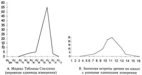 График А представляет собой несколько скошенный острый пик, полученный при тестировании с использованием таблицы Снеллена, — индекс остроты зрения здесь зависит от распознания ряда самых мелких букв со стандартной дистанции в 20 футов. Так, индивид, который с 20 футов способен разглядеть только те буквы, которые средний человек различает с расстояния 50 футов, имеет индекс 20/50. Нормальное зрение, очевидно, соответствует индексу 20/20. Индекс 20/15 означает, что зрение по остроте превосходит средний уровень. Из-за особого подбора размеров букв в этом тесте не все уровни остроты зрения можно свести к единому знаменателю, вследствие чего на более низких уровнях остроты зрения можно получить индекс больше реального, в отличие от среднего или высшего уровней остроты зрения. Иными словами, различия в уровне сложности между следующими друг за другом рядами букв не равноценны; «скачков» в уровне сложности больше в центре и на отрезке более высоких значений шкалы остроты зрения, чем на отрезке более низких значений. Неравенство единиц измерения можно проиллюстрировать, сравнив единицы измерения таблицы Снеллена с соответствующей шкалой равных единиц для измерения остроты зрения (28, с. 77): Шкала равных единиц 12 3 4 5 6 7 8 9 10 11 12 13 14 15 Т. Кпипя Снеллена 2Q 2Q 20 20 22 20 _20 _ 20 Таблица Снеллена 200 100 70 50 40 30 25 20 15 13 Распределение показателей той же группы из 226 человек по шкале остроты зрения с равными единицами измерения представлено в части В рисунка 17. Видно, что этот график больше напоминает график нормального распределения, чем график распределения значений с неравными единицами измерений. Другие случаи отклонений от нормального распределения могут так же иметь причиной неравенство значений шкалы. Предположим, что в приведенном выше примере полностью задействованы значения обоих концов шкалы, а на отрезке среднего уровня сложности наблюдается недостаток. В результате может получиться распределение с двумя пиками, поскольку индивиды, чьи значения реально располагались бы в центре, займут ближайшие доступные уровни. Об этом эффекте полезно вспомнить при рассмотрении результатов, полученных при тестировании некоторых личностных характеристик, таких, например, как интроверсия — экстраверсия. Такие качества, для обозначения которых используются биполярные термины, могут быть наиболее полно представлены в своих крайних характеристиках, в то время как их средние значения могут быть задействованы Згабо. В таком тесте в центре шкалы ее деления располагались бы реже, чем на отрезках ее крайних значений. В результате весьма вероятным было бы возникновение небольшой бимодности, которая являлась бы следствием особенностей средства измерения, но не свойств испытуемых. Подобным образом, при увеличении числа пунктов на крайних отрезках шкалы, нормальное распределение может быть преобразовано в относительно плоское. Теперь мы видим, что измерительная шкала может воздействовать на форму графика распределения по-разному. Строго говоря, невозможно определить истинное распределение, если у нас нет шкалы с равными единицами измерения. Но мы в настоящее время можем разрабатывать такие шкалы с равными единицами для психологических тестов, только если предположим, что тестируемое качество относится к нормально распределенным! При этом спрашивать, что это 