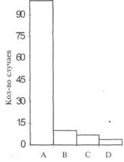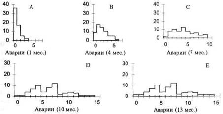 Здесь необходимо предостеречь: мы не должны делать вывод о причинах проблемного поведения на основании формы графика. Как отмечалось в предыдущих разделах, на форму графика могут влиять свойства шкалы измерения. Например, выделив центр шкалы, мы можем из нормально распределенной переменной получить J-кривую. Подобно любому другому частотному распределению J-кривую можно исследовать с точки зрения адекватности измерительной шкалы, процедур выборки и других условий, которые могут повлиять на форму распределения. Другим фактором, который может давать частотное распределение в форме J-кривой, является Этот тип распределения представлен на рисунке 20 графиком А, который показывает действительное число аварий, происшедших у 59 водителей в течение одного месяца. Можно сказать, что здесь мы имеем дело с J-кривой, пик которой совпадает с полным конформизмом, предполагающим соблюдение правил безопасности, и с отсутствием аварий. Или мы можем попытаться объяснить форму распределения по-другому, например присутствием малой группы «склонных к аварии» людей. Взглянув на другие графики на рисунке 20, можно сказать, что главный фактор в действительности оказывается артефактом конкретной наблюдаемой выборки.