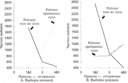 А — остановка; В — очень медленно; С — чуть медленнее; D — с той же скоростью Необходимо отметить, что местоположение пика зависит от того пункта на шкале, на который падает социально обусловленное поведение. Крайние значения реальной J-кривой проявляются не во всех ситуациях социального конформизма. Так степень, до которой напиваются городские взрослые американцы, возможно, предстанет на графике в виде пика, но это не будет действительно крайняя точка, а всего лишь средняя, соответствующая «умеренному социальному уровню». Эта точка, возможно, проявляет максимальный конформизм для групповой практики, но она не отражает ни максимума, ни минимума в питейном поведении. Важна не сама по себе J-кривая, но, скорее, тот факт, что изменения в графике распределения могут быть инспирированы социальным конформизмом. J-кривая — это всего лишь конкретный пример, вызванный этим фактором. Мимоходом добавим, что кривая на рисунке 18 на самом деле представляет собой обращенную в другую сторону J, которую точнее можно назвать L-кривой. Но по договоренности все подобные очень сильно скошенные кривые принято называть J-кривыми, безотносительно к тому, является ли пик левым или правым крайним значением. Конечно, положение шкалы может быть произвольно изменено так, чтобы пик находился слева или справа. Несколько иное применение понятия J-кривой дается в недавно проведенном исследовании юношеского поведения в отношении ровесников (20). В этом исследовании 629 студентам-первокурсникам дали списки с именами их одногруппников (в группе в среднем 35,5 человек) и попросили проставить напротив имен номера от 1 до 5, соответствующие следующим утверждениям: «Хотелось бы, чтобы он был моим лучшим другом», «Хороший друг», «Не дружеские, но нормальные отношения», «Не знаком с ним» и «Чужой человек в группе». Для построения таблицы исследователь соединил первые два рейтинга в категорию «принятие», последние два — в категорию «изоляция и неприятие», а центральный — выделил в качестве категории «пассивного принятия, или терпимости». Результаты распределения изображены на рисунке 19. Два графика в части А показывают рейтинги, данные юношами другим юношам и девушкам в своих группах. Соответствующие графики рейтингов, данные девушками, показаны в части В. Согласно мнению исследователя, эти графики показывают конформизм, присущий в нашей культуре большинству юношей и девушек в возрасте полового созревания или немного моложе. Как следствие, они отражают широкое принятие испытуемыми тех, кто относится к одному с ними полу и возрасту в сочетании с тенденцией избегать представителей противоположного пола — эта тенденция сильнее в юношах, чем в девушках.