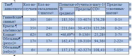 Е — входное отделение; D — дверь в отделение с едой; F — приманка; 1, 2, 3 — дощечки, на которые животное должно наступить Хотя исследования, проводимые с проблемным ящиком были направлены главным образом на то, чтобы выяснить, сколькими «шагами» могут овладеть животные каждого вида, полученные данные однозначно свидетельствовали о внутривидовых индивидуальных различиях. Индивиды различались между собой не только количеством попыток, которые были необходимы им для обучения каждому «шагу», но и общим количеством «шагов», которым они могли научиться. В таблице 2 приводятся сведенные вместе данные, включая крайние значения количества «шагов», которыми овладел каждый вид, число индивидов, обучившихся делать 1 «шаг», а также среднее значение, крайние значения и стандартные отклонения множества качеств, необходимых для обучения 1 «шагу». Последние данные касаются только 1 «шага», поскольку несколько членов в каждой группе смогли овладеть только им одним.