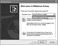 Кстати, если у вас есть доступ в Интернет, самым правильным выходом будет «скачать» самые новые драйверы для всех устройств, установленных на вашем компьютере, и сохранить их в отдельной папке. Новые версии драйверов вы всегда можете найти в Интернете на страничке фирмы-производителя ваших комплектующих. Эти адреса обычно бывают указаны в документации к устройствам, а небольшой список вы сможете найти в приложении к этой книге. А вот устройства, для которых дополнительные драйверы вам не понадобятся - и не стоит бороздить просторы Интернета, пугая завсегдатаев отчаянным поисковым криком, или требовать их у продавца в магазине: ¦ мышь; ¦ джойстик; ¦ клавиатуру (исключая накрученные «мультимедийные» модели); ¦ практически все виды дисководов; ¦ жесткий диск; ¦ монитор (не всегда); ¦ колонки. В принципе, при наличии на вашем компьютере работоспособной версии Windows предыдущего поколения вы вполне можете обойтись и без магических трюков с загрузкой с CD, и без полной переустановки системы. Просто вставьте диск с установочным комплектом Windows в дисковод вашего компьютера… и вот уже перед вашими глазами настойчиво маячит табличка, приглашающая начать процесс обновления операционной системы. Все модификации операционной системы, начиная с Windows 98, обновляются до ХР без особых хлопот.