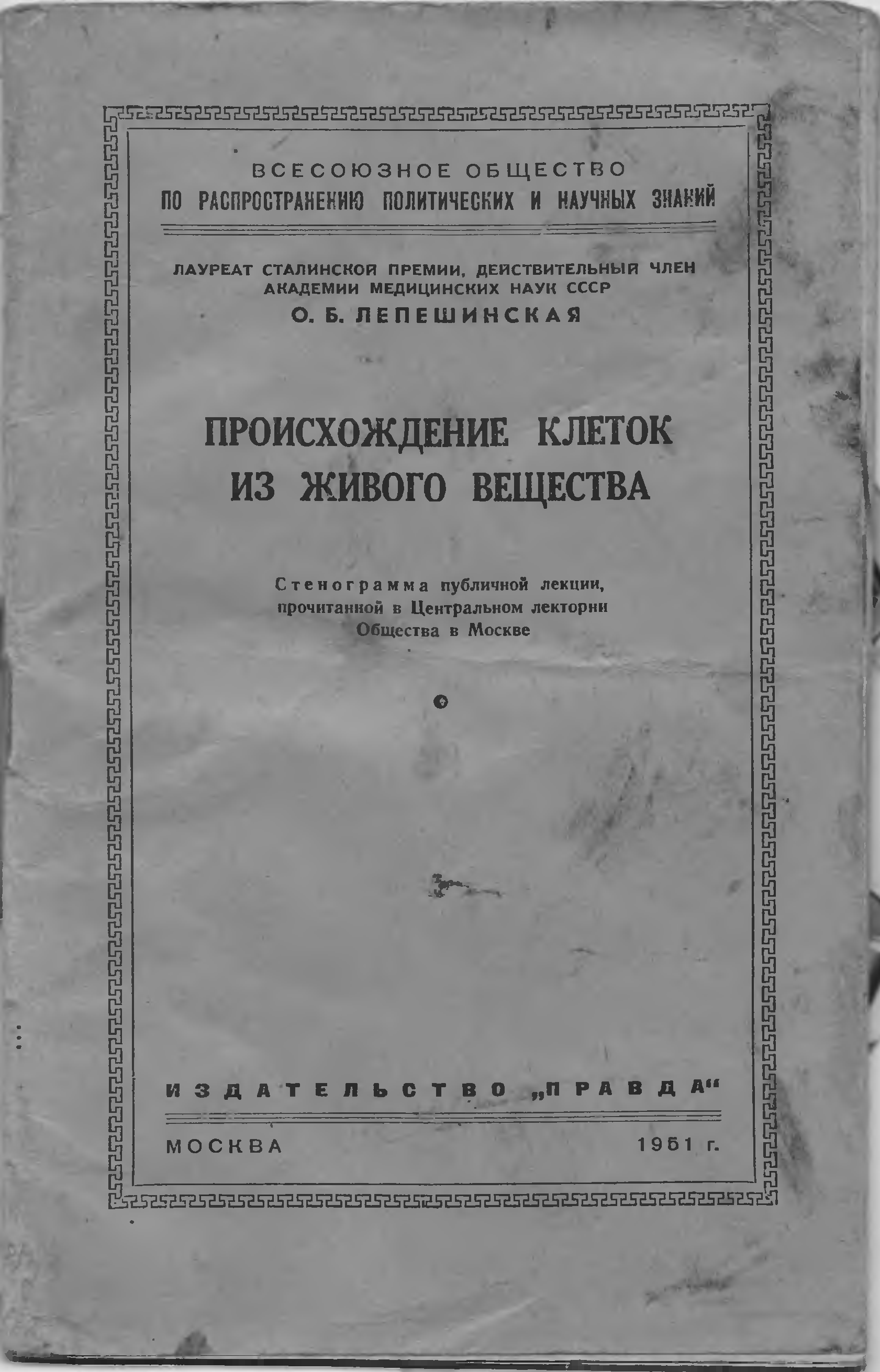 "Происхождение клеток из живого вещества. Стенограмма публичной лекции, прочитанной в Центральном лектории Общества в Москве" - читать интересную книгу автора (Лепешинская Ольга Борисовна)