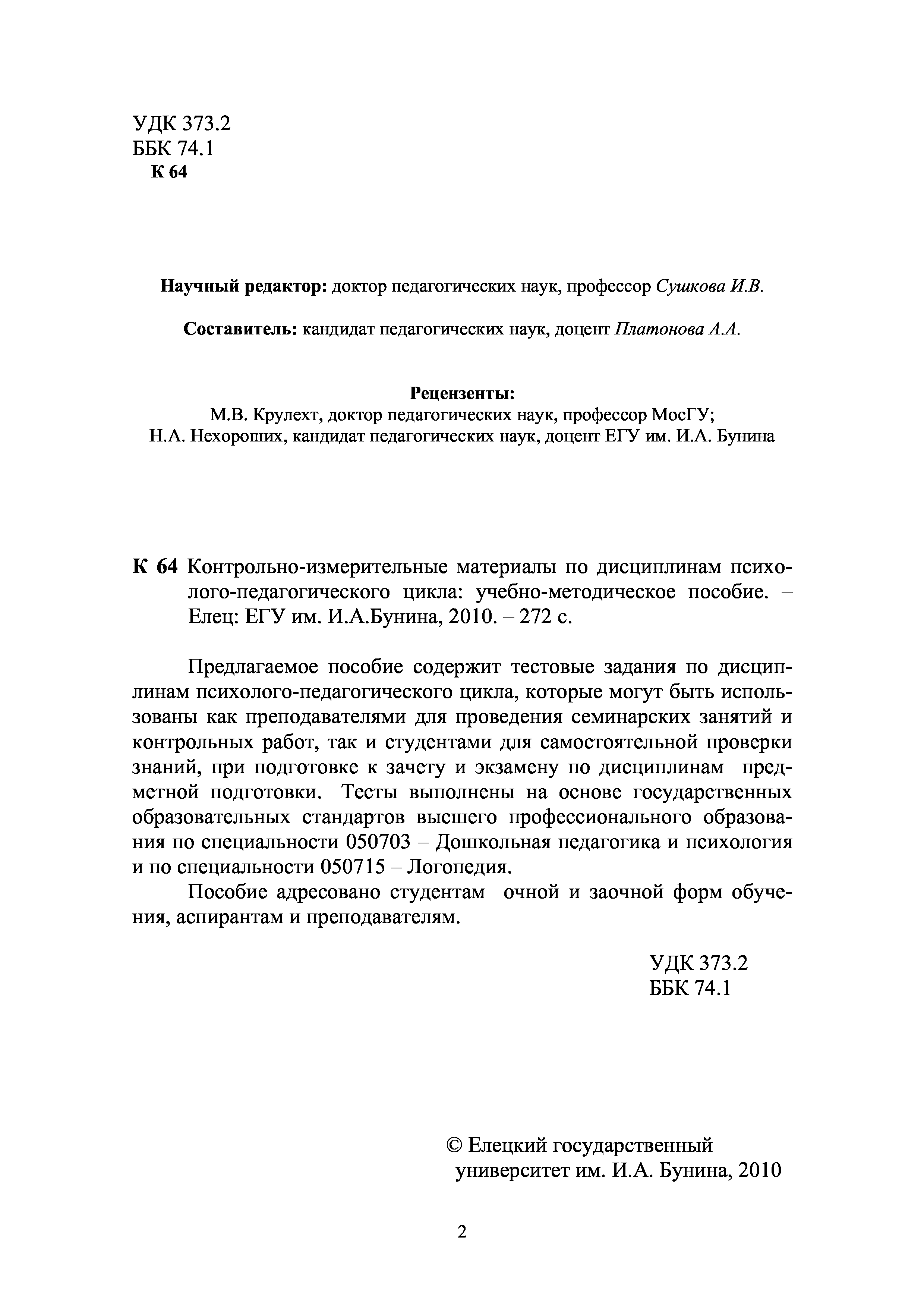 "Контрольно-измерительные материалы по дисциплинам психолого-педагогического цикла: учебно-методическое пособие" - читать интересную книгу автора