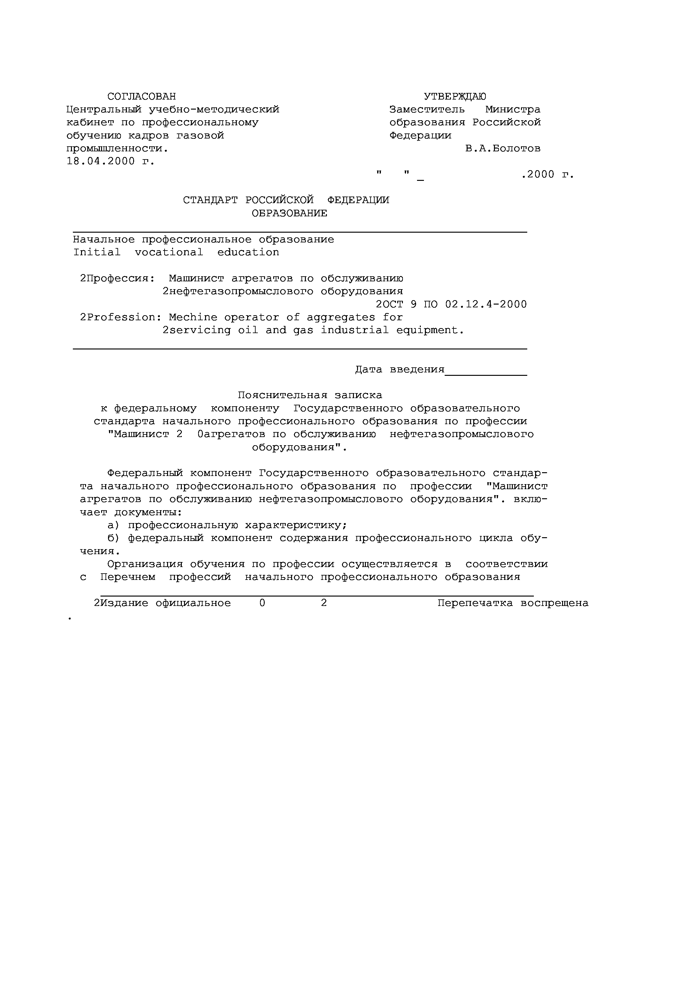 "Профессия ''Машинист агрегатов по обслуживанию нефтегазопромыслового оборудования''. Государственный образовательный стандарт начального профессионального образования" - читать интересную книгу автора