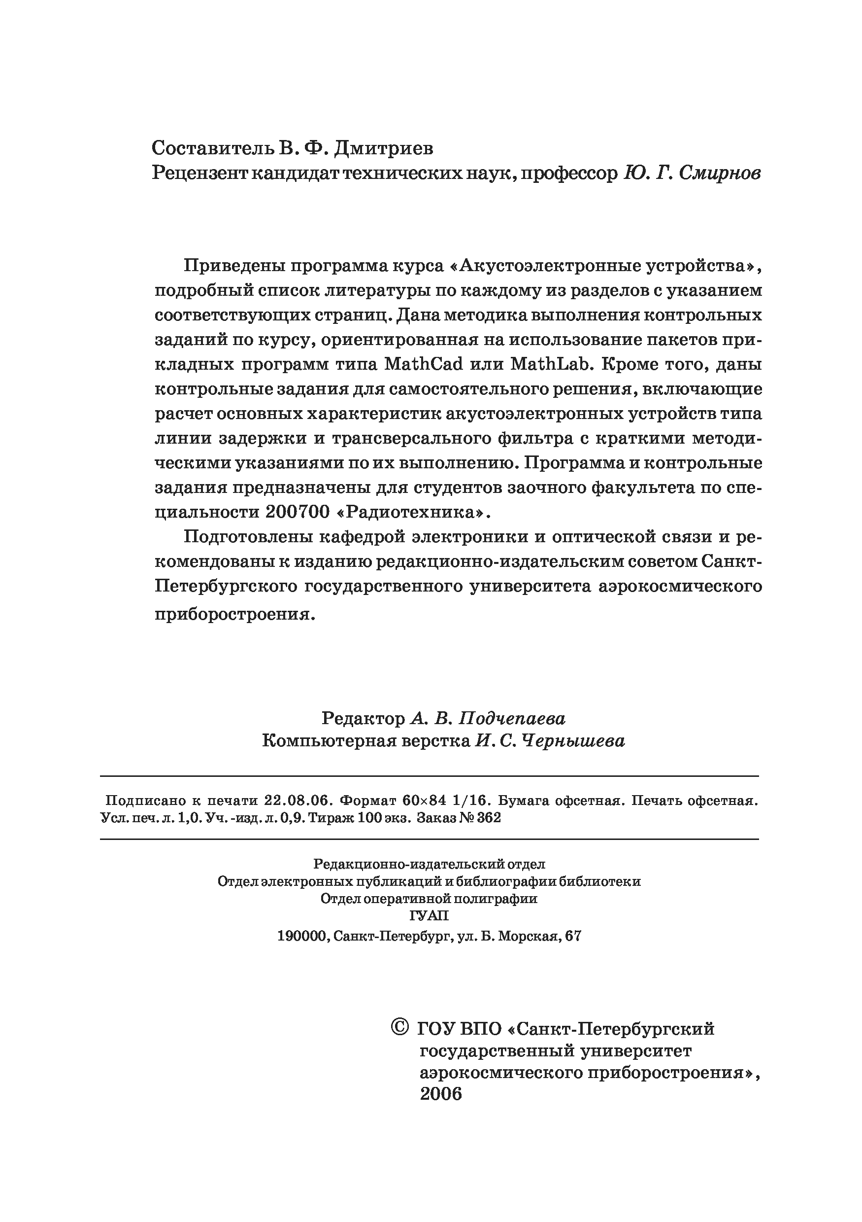 "Акустоэлектронные устройства: Программа, методические указания к выполнению контрольной работы и контрольные задания" - читать интересную книгу автора (Дмитриев В.Ф.)