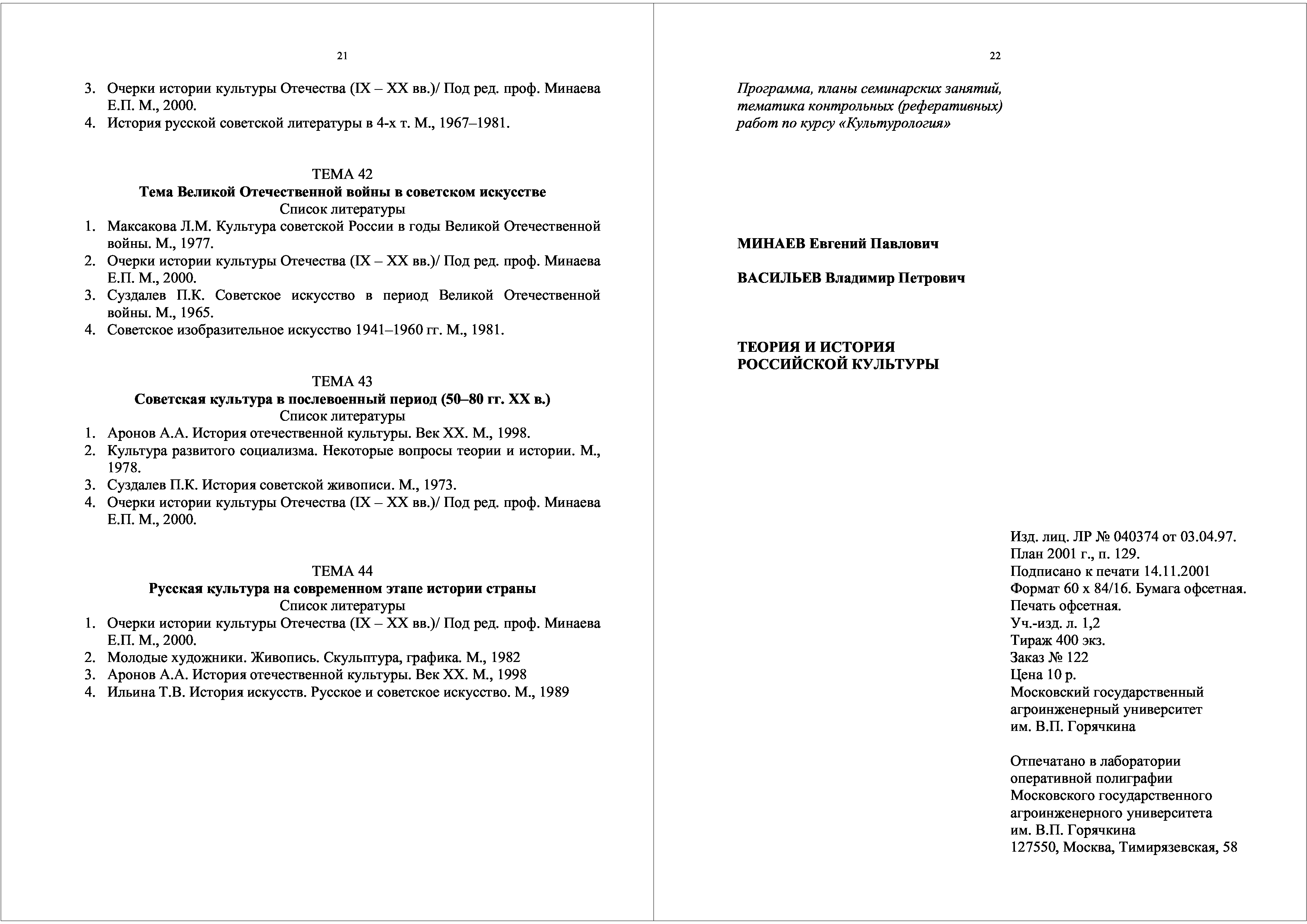 "Теория и история российской культуры: Программа, планы семинарских занятий, тематика контрольных (реферативных) работ по курсу ''Культурология''" - читать интересную книгу автора