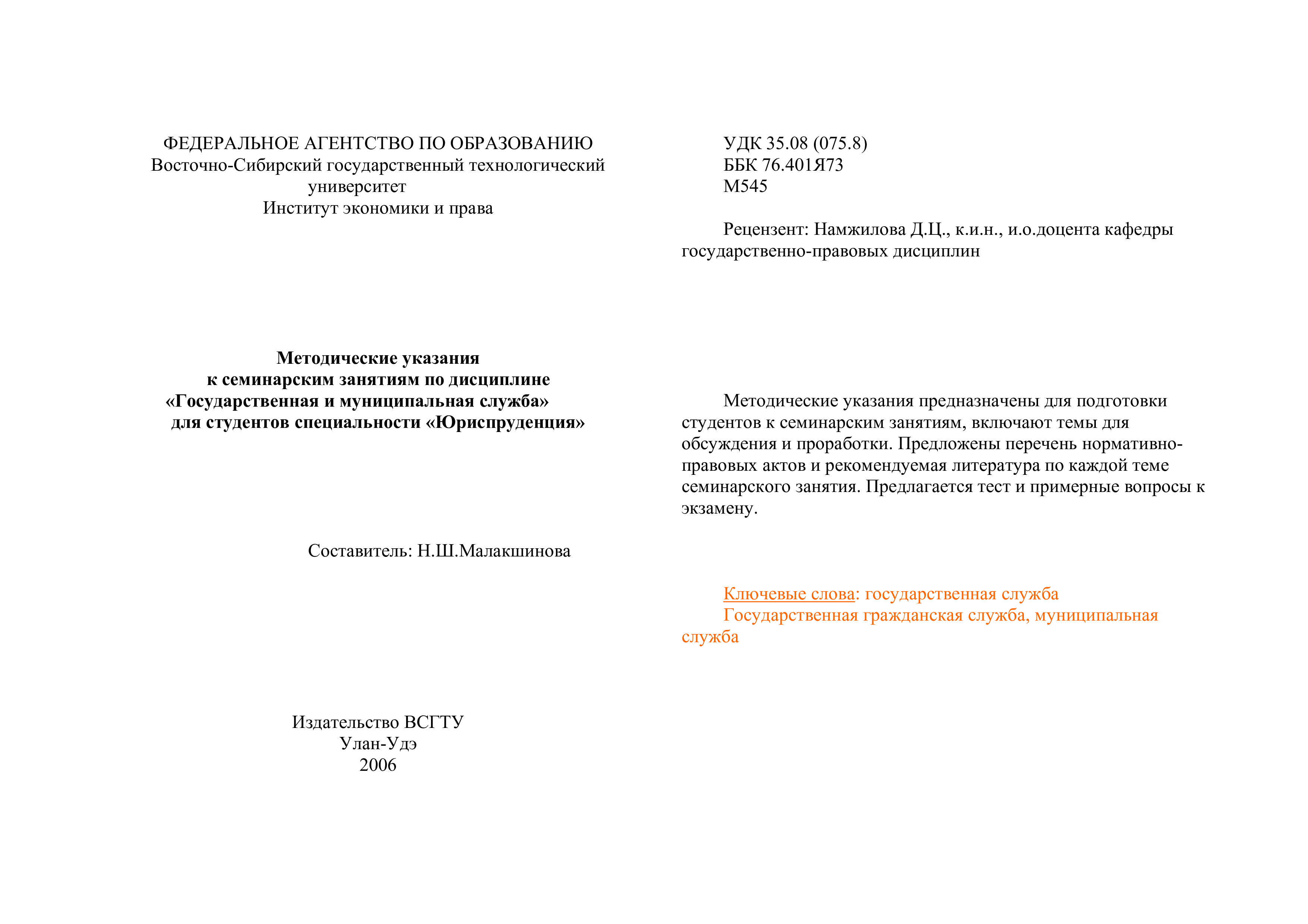"Государственная и муниципальная служба: Методические указания к семинарским занятиям для студентов специальности ''Юриспруденция''" - читать интересную книгу автора