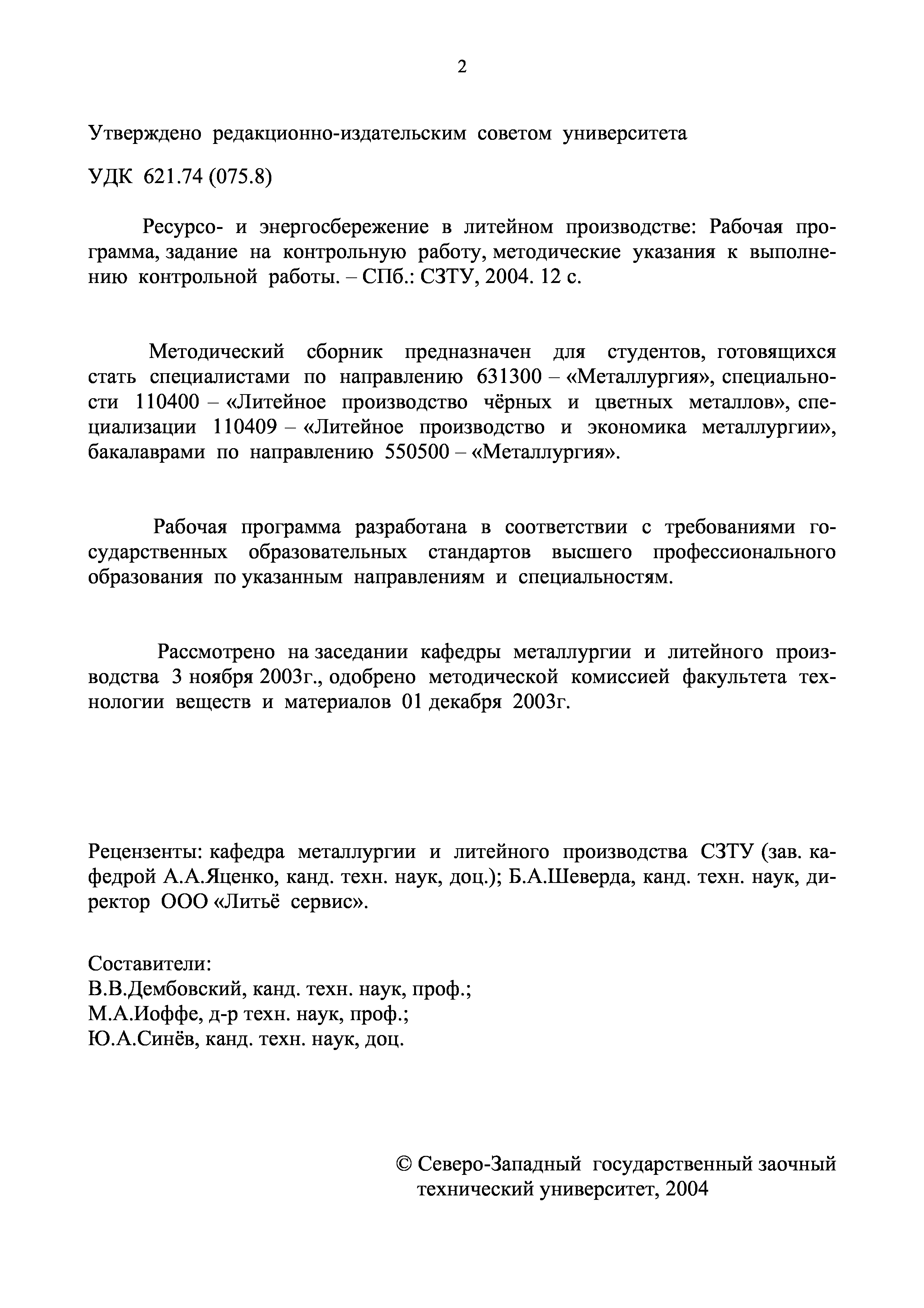 "Ресурсо- и энергосбережение в литейном производстве: Рабочая программа, задание на контрольную работу, методические указания к выполнению контрольной работы" - читать интересную книгу автора