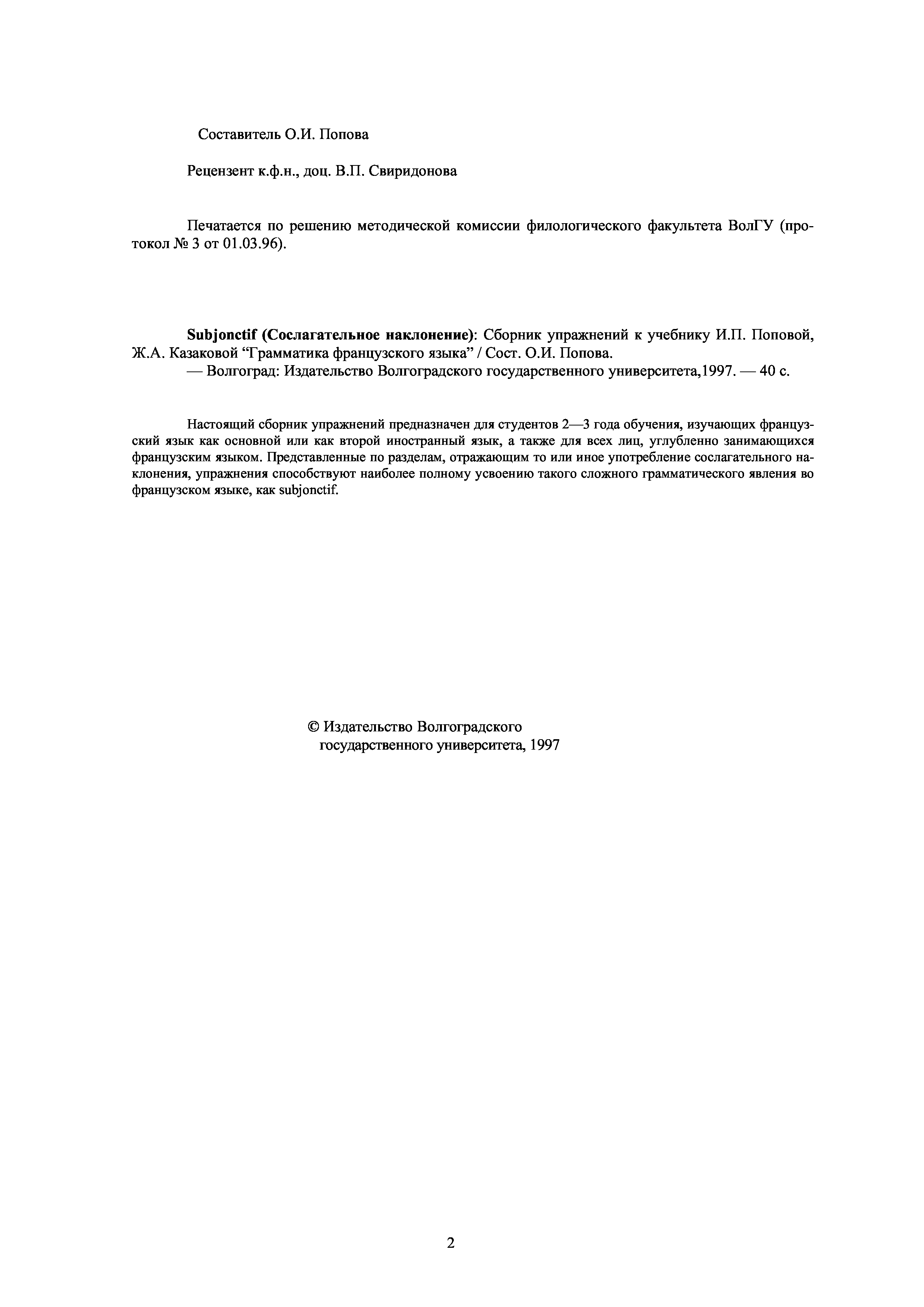 "Subjonctif (Сослагательное наклонение): Сборник упражнений к учебнику И.П. Поповой, Ж.А. Казаковой ''Грамматика французского языка''" - читать интересную книгу автора (Попова О.И.)