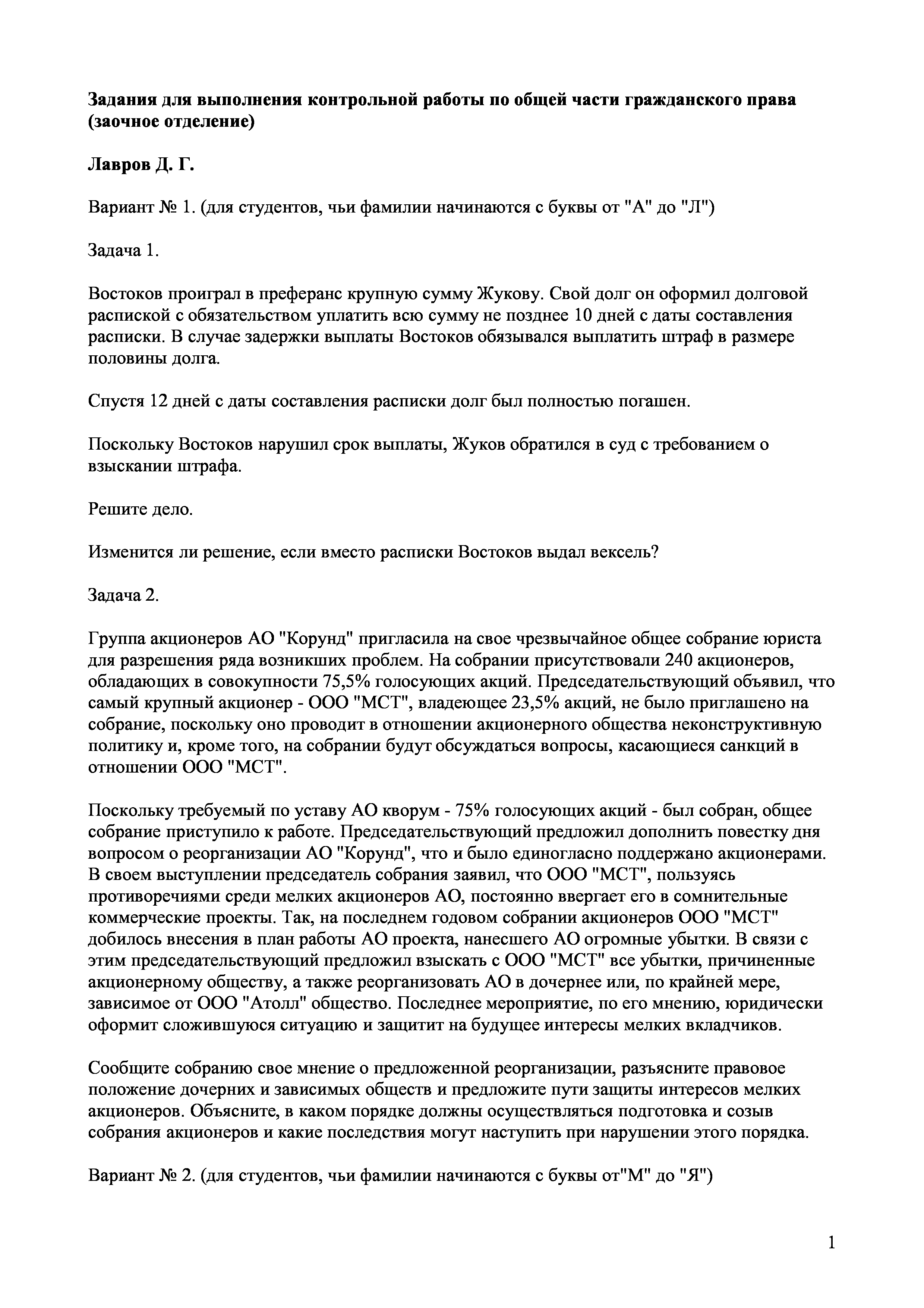 "Задания для выполнения контрольной работы по общей части гражданского права (заочное отделение)" - читать интересную книгу автора