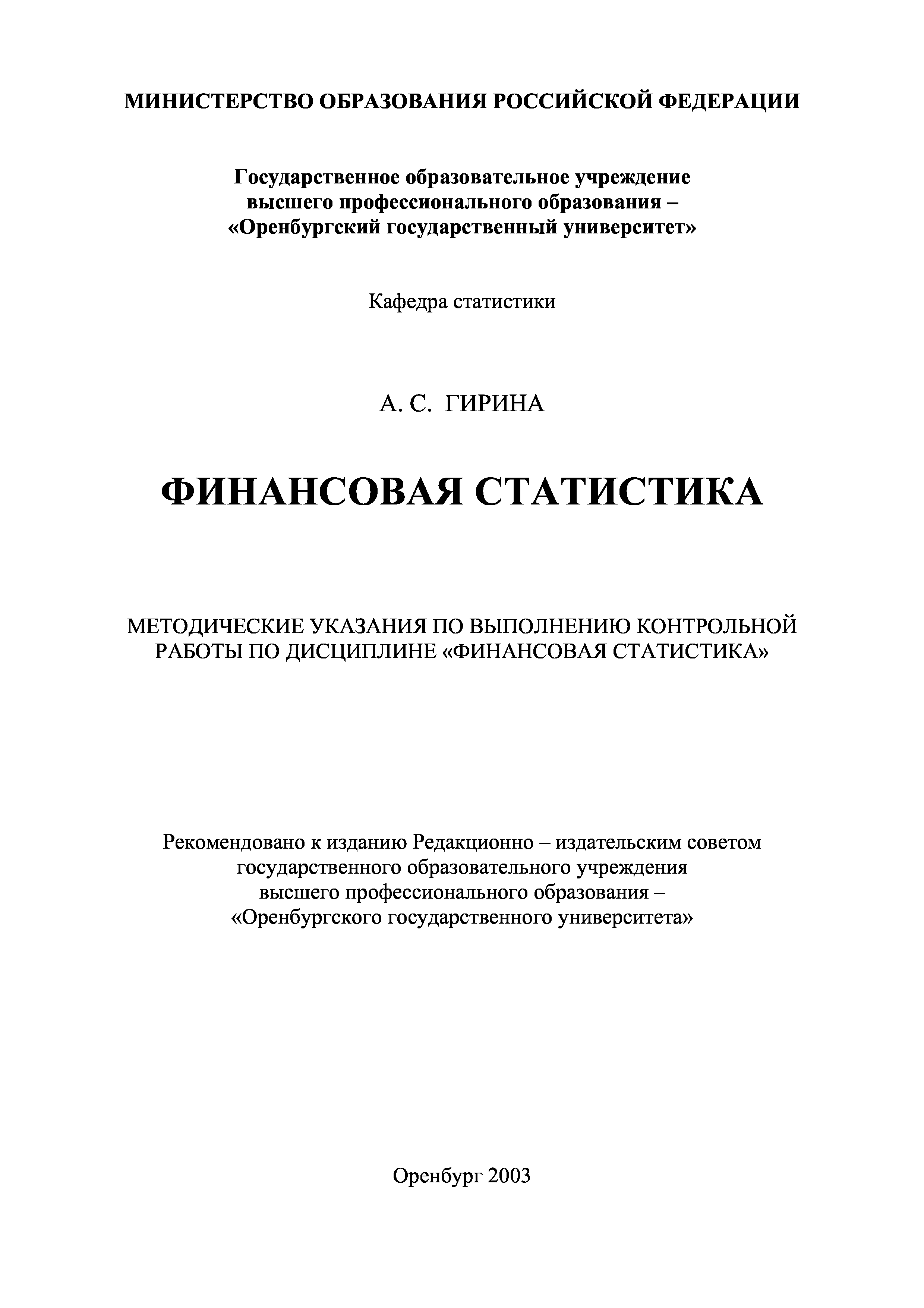 "Финансовая статистика: Методические указания по выполнению контрольной работы по дисциплине ''Финансовая статистика''" - читать интересную книгу автора (Гирина А.С.)