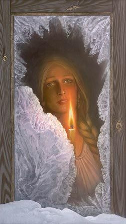 Девушка ничего не слышала. Прижав руки к груди, она неотрывно смотрела на картину и… видела себя. На холсте, по ту сторону заиндевевшего окна, поросшего ледяными узорами, стояла она… она сама! Русоволосая, бледная, с горящей свечой в тонких пальцах. И это в ее собственных глазах застыло ожидание, предчувствие… Неизменное для русских женщин на протяжении многих веков ожидание счастливого мгновения и одновременно готовность принять на себя чужую боль, разделить ее с несчастным стали близкими нашей современнице.