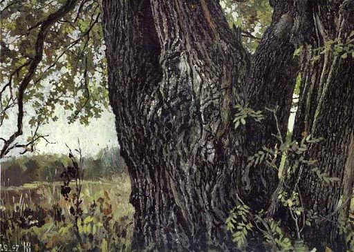 Весь этот сплав народного мифотворчества и живой природы Васильев мастерски отразил в своих полотнах. Среди работ художника нет ни одного нейтрального пейзажа, каждый несет ярко выраженное чувство. Вот, казалось бы, скромная работа, где на фоне молодых зеленых побегов изображен могучий древний дуб. Этот исполин с царственной мощью расположился на кусочке отведенной ему судьбой земли. Он стоит там, сохраняя гордость и величие, словно не замечая того, что утерял всех своих сверстников… Но, видимо, знает этот патриарх лесов какую-то тайну и хранит ее до поры, чувствует еще в себе силу и ждет условного часа…