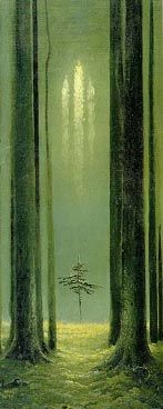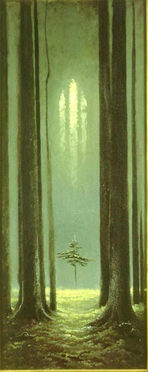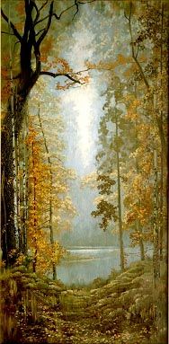 Есть у Алексея Константиновича Толстого интересная запись о работе Фидия «Зевс»: «Ласковый царственный взор из-под мрака бровей громоносных…» Что-то родственное, мощное несет и васильевский «Дуб»: фактура ствола крупная, иссеченная и в то же время притягательная своей теплотой. Пейзаж этот дает зрителю не только чисто эстетическое наслаждение – он пробуждает способность понять сокровенное… Продолжая совершенствовать это направление живописи, Васильев глубоко проникает в тайны состояния природы. И к концу своей трагически оборвавшейся жизни создает удивительно одухотворенные пейзажи «Осень» и «Лесная готика», в которых показывает примеры высочайшей пластики, богатейшего колорита, великолепной композиции и рисунка. Константин очень любил осень, щедрую многообразием красок, и, собрав лучшие ее черты-приметы, написал обобщенный образ этого времени года. Его «Осень» как бы извиняется перед зрителем за остывающее лето буйством цвета, необычной тишиной и торжественностью леса, который хотя и лишился птичьих песен, но не опустел! он дышит, он несет в себе мощный заряд накопленной за лето энергии и щедро посылает его всему живому. Пейзаж, выразивший ощущение художника, превратился в сгусток красоты. Причем средства, которыми живописец этого достиг, обычны. Несмотря на многообразие используемой палитры, его трудно упрекнуть в излишней пестроте красок, свойственной импрессионистам. В пейзаже нигде нет чистых цветов; везде переходы, оттенки, рефлексы. И словно сама гармония торжествует на полотне. Здесь художник очень современен эпохе. В век активизации всех происходящих на земле процессов он, как никто другой, дал нам понятие об интенсивной красоте, об интенсивном, насыщенном духовном плане. Его повышенно-эмоциональное отношение к жизни, художественные обобщения, доведенные до известной крайности выражения, есть не что иное, как романтизм. К романтическим можно отнести и работу Васильеве «Лесная готика». Пейзаж этот он написал в период активного увлечения историей и культурой других народов, когда его заинтересовало время перехода европейцев к ренессансу. Не к итальянскому, а к мужественному северному ренессансу, к возрождению светлой идеологии и культуры.