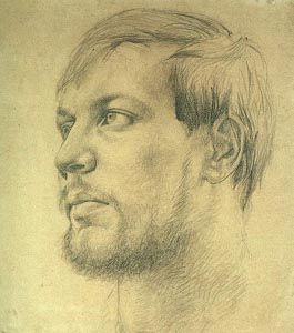 Но если бы художник сделал портрет только отвлеченно-символическим, он лишил бы его убедительности. Реалистическое изображение внешности писателя придает портрету правдивость… Васильев удивительным образом всегда ощущал какую-то внутреннюю духовную связь с Достоевским. И в своем последнем автопортрете сумел выразить это, умышленно подчеркнув действительно имевшееся внешнее сходство с писателем. На этом автопортрете, завершенном менее чем за два месяца до гибели, художник изобразил себя в момент тяжелого, напряженного раздумья. Его взгляд обращен на зрителя, от которого он ждет творческого, созидательного участия; в этом взгляде – волевая, организующая собранность. А выбранная поза, рука, лежащая на плече, лицо, молодое, но с какой-то старческой уже обреченностью – все это внешнее нарочито выпячено художником, чтобы не сразу бросалось в глаза сокровенное… Васильев оставил нам всего четыре своих автопортрета. На первом – четырнадцатилетний подросток с простым ясным лицом. Во взгляде – искра первого понимания высокого своего предназначения как человеческой личности. На втором – двадцатилетний Константин на фоне бронзового Марса, символизирующего в данном случае интеллектуальную силу. Еще один автопортрет – 1970 года: строгий профиль мужчины в скромном черном пиджаке.