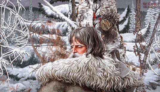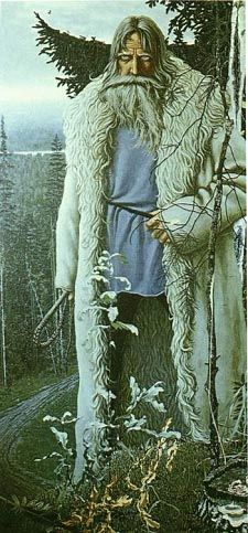 В облике этого старца художник попытался представить мудрость человеческого опыта. Поднявшийся великан соединил собой два мира: небо и землю, подобно мифологическому «древу жизни» – соединителю двух сфер. Васильев напоминает, что на Земле произрастают не только цветы и деревья, но и человеческие жизни. Словно корнями врос старец в землю, еще не проснувшуюся от холодного сна. Мех его шубы, схожей своей фактурой с заиндевевшими кронами деревьев, свидетельствует о былой связи его с зимним лесом. Человек поднялся из самой природы и достиг таких высот, что головой подпирает небесный свод. Но что же взял с собой мудрец в нелегкий путь, равный, возможно, жизням многих поколений, чтобы связать собою два начала и достичь гармонии мира? В основу истинного возвышения художник кладет всякое творческое горение (символ его – сгорающий свиток с собственным псевдонимом), очевидно, полагая, что только творческая мысль, рожденная из знания, способна достичь космических высот. Но сгорает имя! И в этом есть второй, личностный смысл. Истинный художник, истинный мыслитель должен полностью забыть о себе ради людей, ради всего народа, только тогда он становится живительной силой. Творчество – одно из величайших проявлений человеческого духа. Из пламени и пепла пробивается вверх небольшой росток дуба – знак вечности. Дубок изображен наподобие нанизанных один на другой цветов трилистника – древнего символа мудрости и просвещения. Неумирающие знания оставил на земле огонь творчества! Над ростком горит светоч, зажатый в правой руке старца. Видимо, это и есть главное, что взял и несет с собою мудрец. Светоч – символ ровного и неугасимого горения души. Ореол свечи выхватывает тонкие черты лица человека, соединяющие в себе редкую сосредоточенность с возвышенностью мыслей. Какой-то особый смысл переполняет загадочные глаза старца. В них самоуглубление, зоркость не только зрительная, но и внутренняя, духовная. Над седой головой он держит плеть, а на рукавице той же руки сидит грозная по виду птица – филин. «Живой» ее глаз – всевидящее око – завершает движение вверх: дальше – звездное небо, космос. Плеть или бич необходимы, чтобы в любых условиях сохранять стойкость духа: без самобичевания, самоограничения недостижима истинная мудрость. И, наконец, изображение филина, совы у разных народов всегда было символом мудрости, беспристрастного видения мира. Филин – птица, для которой не существует тайн даже под покровом ночи. Это то откровение, к которому стремится и которого рано или поздно достигнет грядущий человек. Поэтический образ старца, рожденный художником, как бы включается в вечную жизнь природы и «высказывает то, что молчаливо переживается миром». Картина утверждает великую ценность самой жизни, неумолимого ее движения, развития. Она предвещала начало некой новой живописи. Художник, завершив полотно, сам это ясно почувствовал и, может быть, впервые испытал острую потребность в уединении, чтобы глубже осмыслить найденное направление. Вместе с братом Анатолия Кузнецова Юрием, заядлым охотником, Константин ушел в Марийские леса. Четверо суток находились они в тяжелейших условиях: спали при десятиградусном морозе в палатке без какого-либо утепления, а из пищи у них был только лук да немного спирта, больше ничего, собирались то они наспех и надеялис