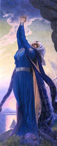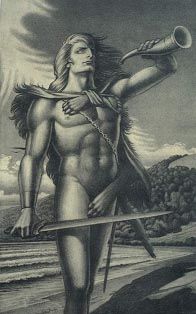 Еще одной картине, посвященной опере «Валькирия», художник дал название «Заклинание огня». На полотне – верховный бог, склонившийся над своей любимой прежде дочерью Брунгильдой. Он решил наказать своевольницу, погрузив ее в волшебный сон, и теперь с грустью прощается с валькирией. За его спиной уже взметнулась стена огня. Отныне Брунгильда пламенем отгорожена от всего мира, и только подвиг героя, который не убоится копья верховного бога, сможет вернуть ее к жизни. (До недавнего времени картина «Заклинание огня» считалась утраченной. Но неожиданно усилиями друзей и почитателей таланта художника она была обнаружена в городе Вологде и возвращена ее последним владельцем Клавдии Парменовне.) Третью оперу этого цикла, «Зигфрид», Васильев проиллюстрировал графическим портретом главного героя, вложив в эту работу всю мощь своего таланта. В величественной фигуре Зигфрида мы видим силу и красоту возрожденного героического язычества. Зигфрид звонко трубит в свой рог, вызывая достойного соперника на бой. На плечах его волчья шкура, в правой руке обнаженный меч, выкованный им из обломков Зигмундова меча – священная память об отце. Одного этого образа зрителю достаточно, чтобы поверить в близкого к природе идеального героя, не знающего страха и лишенного пороков власти золота. Он сумеет перерубить преградившее ему путь копье Вотана, пробудить к новой жизни, к земной любой Брунгильду и отвоевать у дракона-великана золотой клад нибелунгов.