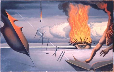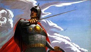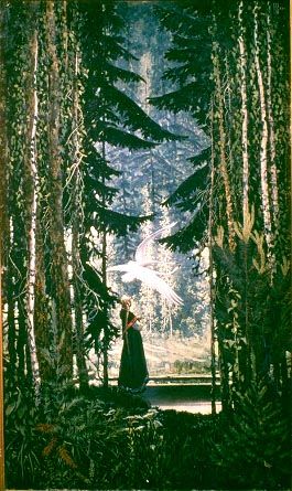 Существует, правда, и другой, предварительный, вариант картины под названием «Русский витязь». Богатырь изображен на ней на фоне причудливых облаков, присмотревшись к которым мы вдруг замечаем очертания все тех же образов, которые мог принимать Вольга. Витязь в боевом снаряжении; мужественное лицо его сосредоточенно, глаза в напряженном ожидании врага, которого воин изготовился встречать поднятым мечом. Это всего лишь холодный стальной клинок, пока только прообраз созданного позднее огненного меча.