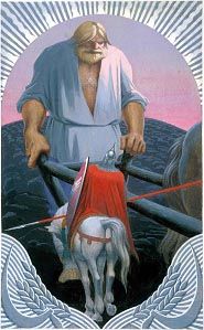 Интересно, что на нагрудной части кольчуги витязя, по бокам от большого золоченого диска, символизирующего солнце, расположены еще два символа того же солнца – это квадраты, а в них равносторонние кресты: весьма древнее обозначение, существовавшее задолго до появления христианского креста. Необычен шлем у воина, на что часто обращают внимание посетители выставок, спрашивая, отчего на голове у русского богатыря немецкий шлем. Видимо, мы привыкли видеть на головах богатырей шеломы, напоминающие по форме купола древних церквей, и нередко забываем о том, что в те давние времена не было поточного производства и каждый воин изобретал шлем поудобнее, чтобы надежно защитить себя в бою. Васильев в каких-то архивных материалах высмотрел своеобразный воинский головной убор русского витязя и перенес его на картину. Стиль его работы не допускал на полотне ни одной случайной, невыверенной детали. Работа над Вольгой подтолкнула фантазию художника; он попытался воссоздать образ Сварожича, славянского бога огня, и сделал несколько интересных эскизов маслом, но не остановился на этом и использовал эскизы для написания верховного правителя славянского пантеона – Свентовита. Согласно преданиям, в Балтийском море, на острове Руяне, существовал город, в котором находилось верховное святилище этого высочайшего существа. По свидетельству «отца датской историографии» Саксона Грамматика и по другим источникам, попавшим в руки Васильева, в богатом арконском храме стоял идол Свентовита – выше человеческого роста, с четырьмя бородатыми головами, обращенными в четыре разные стороны. В одной руке держал он меч, в другой – рог изобилия. Фигура его была настолько искусно сделана, что ее пугались птицы. Лишь один огромный орел всегда жил и кормился в храме; он считался посвященным Свентовиту. Кроме того, при храме, в большом зале, содержался посвященный верховному божеству белый конь, на котором он якобы выезжал по ночам разить врагов славянского племени. Ездить на Свентовитовом коне было строго запрещено, вырвать хоть один волосок из его хвоста или гривы признавалось за великое нечестие; только жрец мог выводить и кормить его. Возле изваяния Свентовита всегда висели седло и удила. Считаясь богом войны и жизни, Свентовит воспринимался язычниками творцом и правителем Вселенной, именовался дедом.