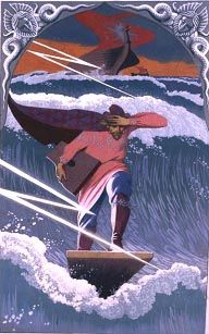 Есть в этом, несомненно, и объективные причины. Одна из них – беззаветная материнская любовь Клавдии Парменовны, боявшейся выпускать его из родного гнезда. Порой критическим оком глянет она на невесту и выскажет потом сыну свое мнение… И другая, наиболее, пожалуй, веская причина. Человека ответственного, Васильева, очевидно, настораживала мысль о тем, что семья может помешать творчеству, ставшему для него смыслом существования. Зарабатывал художник немного и не стремился к дополнительным приработкам. Собственно материального благополучия Константин был лишен, но никаких неудобств от этого не испытывал, со всеми бытовыми трудностями справлялся легко… Действительной жизнью представлялось ему бытие в творчестве, в духовном горении, которое требовало полней отдачи сил. Вот здесь-то художнику постоянно приходилось одолевать трудности, неизменно воюя с неудовлетворенностью достигнутым, нехваткой времени. Именно эта его жизнь была сложна, она не могла дать ему покоя или передышки. Кроме разработки русского эпического наследия, русской мифологии, Константин много делал и в области мифологических сюжетов других народов: искал общность глубоких корней в их творчестве, осмысливая и вычленяя главное. Он прекрасно знал скандинавский и немецкий эпос, мифологию Древней Греции, Рима, индийскую эпическую поэзию. Знания Константин не скапливал, а творчески интерпретировал, и, по существу, это было уже не изучение, а попутное создание своего. Увлекшись скандинавским эпосом, Васильев с карандашом в руках изучил «Исландские саги». И сегодня, просматривая пометки художника, можно словно по расставленным вехам следовать путем его исканий и откровений. Основное место в книге занимают так называемые родовые саги, которые представляют историю всех хоть чем-нибудь проявивших себя исландцев периода IX – XI веков. Что же привлекало здесь художника? Сага – рассказ о больших судьбах и испытаниях людей, вокруг которых формируются все события. Герои саг, как правило, погибают, чему предшествуют вещие сны и предзнаменования. Они знают, что гибель неизбежна, но смело готовятся к ней – в этом их наивысшее испытание. Сила духа этих людей покоряла Константина, а как художника его привлекало в сагах стремление к фактической точности, богатство жизненной правды. Читая эти литературные источники, он легко переносился воображением в те давние исторические времена, и у него рождалась неудержимая потребность отобразить героев и события, связанные с ними, на полотне. Трудно было не поддаться соблазну запечатлеть такой, например, отмеченный художником отрывок из «Саги о людях из Лаксдаля»: «Олав велел взять оружие и встать по бортам корабля от носа до кормы. Они стояли настолько тесно, что все было закрыто щитами. Снизу каждого щита высовывалось острие копья. Олав встал на носу, и вот как он был вооружен: он был одет в броню, и на голове у него был позолоченный шлем; он был опоясан мечом, рукоятка которого была украшена золотом; в руке у него было копье с крючком, которым можно было также и рубить, с великолепными украшениями на наконечнике; перед собой он держал красный щит, на котором был нарисован золотой лев». И такую картину художник действительно написал как заготовку к разрабатываемой теме. Сохранились слайд и фотография с той работы. К описанию изготов