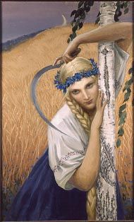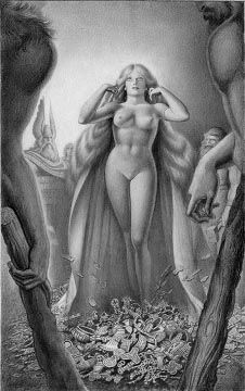 Еще одна графическая работа Васильева, посвященная опере «Золото Рейна», раскрывает ее кульминационный момент, когда в тяжбу за сокровища вовлечены уже боги: Могучий Вотан – верховный бог и бог огня – Логе. Константин, видевший схожесть верховных существ славянского и германского пантеонов, где равными правами наделены Свентовит и Вотан, Сварожич и Логе, ни в коей мере не пытался здесь повторять разработанные им прежде образы. Напротив, он искал новое, вагнеровское их толкование. Сам Вагнер отмечал, что он воспроизводит сказание, начиная лишь с тех пор, когда древние герои уже предстают облаченными в человеческие одеяния». Все его боги очень близки к природе, они обитают не только в горних высях, но и в лесах, на берегах рек. Поэтому Васильев в качестве одеяний дает им чаше всего шкуры различных зверей, их оружием делает копье, иногда меч. Только Вотан и его дочери, воинствующие девы валькирии, имеют доспехи и свои особые одежды, а головные уборы их украшают устремленные вверх орлиные крылья. В центре картины стоит, утопая в драгоценностях, обнаженная красавица. Это Фрейя – богиня любви и вечной юности. За ее спиной, по обе стороны, боги – Вотан и Логе. Перед ней братья-великаны, преклонившие к земле свое грозное оружие: огромные, точно стволы деревьев, дубины. Боги пытаются с помощью сокровищ, добытых обманом у карликов-нибелунгов, выкупить Фрейю, без которой они оказались старыми и дряхлыми. Васильев выхватил напряженнейший момент драмы, сталкивая грозные силы. Художник до предела усилил кульминацию противоборства тем, что в центре картины поместил Фрейю, этот символ непорочной красоты, которую сами боги во имя достижения своих целей покрывают злом – все теми же сокровищами нибелунгов. Васильев настолько точно решил поставленную перед собой художественную задачу, настолько неподражаемо «вылепил» богиню Фрейю, что не смог удержаться и написал самостоятельную работу маслом, назвав ее «Весна». В ней художник, развивая найденный образ, сумел передать удивительную чистоту и непорочность женского существа. «Весна» – это источник света, чистоты. Ее открытая красота способна вызывать к жизни самые высокие и бескорыстные помыслы.