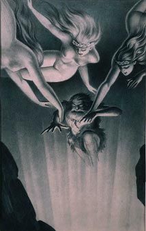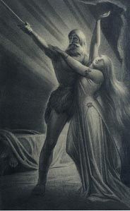В первой графической работе по мотивам этой оперы художник передает момент возвращения Хундинга, мужа Зиглинды, и его встречи с влюбленными. Вид этого воина грозен. Медвежья шкура и плащ поверх нее не скрывают от зрителя крепости мускулистых ног, рук. Воин опирается на копье; на голове его двурогий шлем, из-под которого смотрят неистовые глаза. Кажется, еще секунда – и он бросится на свою жертву – Зиглинду. Но это божественное создание, переполненное долгожданным чувством, открыто смотрит на грубого и жестокого мужа. Она беспокоится не о себе – о любимом, сдерживая его порывы движением своей руки. В центре, несколько в глубине картины, на скамье под древним дубом, восседает, словно патриарх, Зигмунд. Он еще не знает, кто потревожил их счастье, но интуиция подсказывает ему, что этот незваный гость может сделать недоброе его спасительнице. В руках Зигмунда нет оружия, богатырское тело его едва прикрыто клочком звериной шкуры. Но ладонь, грозно положенная на колено, светлый и пронзительный взгляд красавца бородача, его напряженная фигура уже вступили в молчаливое противоборство. На следующее утро назначено сражение. Зиглинда вспоминает о непобедимом мече, оставленном в день ее свадьбы таинственным незнакомцем. Теперь Зигмунд готов к бою! Но явившаяся вдруг дочь Вотана, дева-воительница Брунгильда, приносит герою весть о воле верховного бога: в наказание за недозволенную любовь Зигмунд погибнет в бою. Следующий рисунок раскрывает именно этот эпизод оперы. Зигмунд, опустившись на колено, придерживает одной рукой спящую Зиглинду и, проклиная несправедливость богов, готов уже занести меч над любимой, чтобы она не досталась врагу. Вестница смерти валькирия, пораженная бесстрашием и силой любви воина, принимает решение защищать в бою Зигмунда, нарушив волю отца.