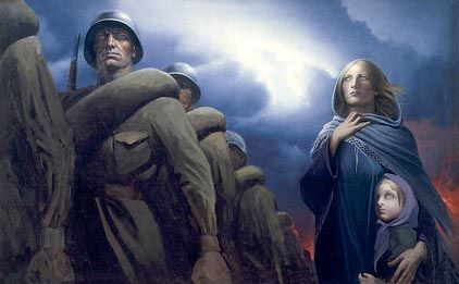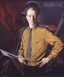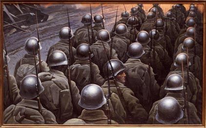 Столь же лаконична и эмоциональна картина Константина Васильева «Тоска по Родине». Первое впечатление – ни единого лица, лишь сплошные леденящие душу ртутным отблеском стальные каски да спины людей в серых солдатских шинелях, уходящих в разверзнутое у горизонта зарево войны. И вдруг – профиль юного солдата, нежные черты под жесткой сталью. Воин посылает, может быть, последний прощальный взгляд любимой Родине…