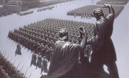Прежде всего взят необычный ракурс. Зритель смотрит на происходящее как бы со стен храма Василия Блаженного, поверх памятника Минину и Пожарскому, нарочно увеличенном в размерах и доминирующему на холсте. И сразу же возникают два символических Васильевских плана. Первый план – формального узнавания. Мы видим ритмические серо-стальные колонны солдат и невольно чувствуем драматичную атмосферу происходящего. В то же время фигуры русских граждан Минина и Пожарского, изображенные в античных тогах, сразу дают нам другой мощный духовный план – бесконечности, неистребимости народа, вызывая исторические ассоциации с нашими пращурами. Эти герои отечественной истории словно благословляют новых героев на защиту самого дорогого – Родины. Удивительно, что мы, зная победоносный конец войны, переживаем в этой картине напряженность ее начала, испытываем ту вдохновляющую силу, которая является только в грозные дни, наполняя патриотизмом сердца.