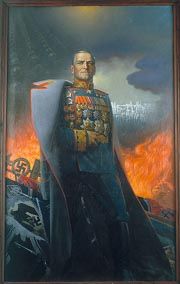 В понимании Васильева определенная условность и торжественность парадного портрета совершенно необходимы. Ведь не случайно, например, символика, сопутствующая парадному военному оркестру, помпезна: духовой оркестр на марше всегда выглядит праздничным, вызывает приподнятое настроение. Так и у портретов людей, овеянных легендарной славой, зритель должен испытывать духовный подъем, взлет своих устремлений. И Васильев со всем своим тактом, не злоупотребляя художественными средствами этого направления, начал задуманную серию. Картина предельно символична. На переднем плане – легендарный маршал Г. К. Жуков, попирающий штандарты и знамена – символы былого величия «третьего рейха». Наброшенная на его плечи шинель подобна крыльям, взметнувшим этого человека к славе. А дальше, в глубине, оживает сама история: на фоне прокопченного российского неба, мятущегося и грозного, – остовы домов разрушенного Сталинграда. Но близок очищающий огонь возмездия, языки его пламени, поднявшиеся за спиной маршала, уже разгоняют скверну. И мы видим, как откуда-то из поднебесья, сквозь легкую дымку облаков, идут колонны русского воинства. Эта символика подчинена одному стремлению – передать ту страшную, трагическую и в то же время великую эпоху, которую пережил наш народ, народ, способный в лихую годину выдвигать из своих рядов непобедимых полководцев. Во всем строе этой новаторской работы ощущается могучее воздействие не только народного мифотворчества, но и школы великих мастеров живописи. Здесь и филигранная техника, и удивительное чувство цвета, и целый арсенал разнообразных технических приемов и средств, используемых художником. Портрет маршала Жукова показал, какие неисчерпаемые возможности таит в себе могучая сила реализма, способная создать необыкновенно емкую художественную форму. На посмертных выставках К. Васильева люди с воодушевлением подзывали друг друга посмотреть этот портрет, как бы они это делали, если бы проходил сам живой народный военачальник. И действительно, первое впечатление от портрета Жукова – народный героический подъем и мощная победа, слившаяся из миллиона простых лиц в единое лицо полководца, истинного героя второй мировой войны, сына своей Родины, уроженца деревни Стрелковка Калужской области. Тема Великой Отечественной войны не раз порождала романтические взлеты в советском реалистическом искусстве. Но у Васильева и сам выбор темы определен его внутренним духовным устремлением. Романтика заложена в самой природе этого человека, в его художественной интуиции. Постоянно совершенствуя и одухотворяя свои художественные образы, Васильев в портрете Жукова выходит на новый качественный уровень, делает попытку высказать какую-то главную, мучительную мысль. В картине окончательно выражена основная идея автора: борьба за сильного и красивого человека. Художник не случайно выводит внутреннюю борьбу человеческих страстей на бранное поле, бросает в пламя войны. Война – время, когда четко поляризуются характеры. Война – место, где чистые и светлые силы идут на смерть во имя Родины, а всякая нечисть прячется или мародерствует. Героическое у Васильева всегда рядом с трагическим, его герои часто гибнут, но обязательно нравственно побеждают. Сталкивая антиподы в бескомпромиссной ситуации, художник призывает на