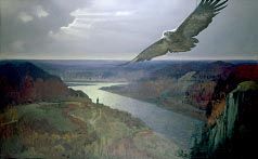Когда в условленное время Васильев снял с полотна покрывало, в комнате воцарилась необычная тишина. Друзья предполагали увидеть какую угодно птицу, но… мужика с топором никак не ожидали. Однако талант художника неудержимо притягивал взгляды каждого к картине, заставлял думать, восхищаться небывалой внутренней силой созданного образа. Зрителя буквально сверлил орлиный взгляд мужественного человека, властелина тайги, одухотворяемого природой и одухотворяющего первобытную стихию леса своим трудом, мужеством и волей. Картина радовала сияющим тоном, поражала сложностью тончайшей игры света в бесконечном узоре инея, заснеженной хвои, веток, стволов. И красота эта окружала человека, от которого веяло не только недюжинной силой, но и звонкой ясностью, веселостью, счастьем неразрывной жизни с лесом. Зрителю хотелось такого же увлечения делом в гармонии со всем окружающим. Мысль художника сумела, поднявшись над обычным житейским фактом, прикоснуться к стихии народного мифотворчества. И друзья остро почувствовали значимость рожденного полотна. Первым пришел в себя Анатолий Кузнецов: – Да, Костя, такого мне видеть не доводилось. Твоему мужику с топором есть что сказать. И я прекрасно понимаю, о чем он молчит. – Вместо того чтобы каламбурить, подумал бы лучше, почему этот орел северный, – осадил его Шорников. – А чего же тут неясного? – заговорил опять Кузнецов. – При оценке некоторых человеческих качеств можно делить земной шар на параллели: чем севернее народ, тем он мужественнее. Измени природу – и человек родится другим. – Но твой «Северный орел», Костя, наверное, тысячелетней давности? – поинтересовался Пронин. – Ну почему же, в народной мифологии герои не умирают. И если прикоснуться к душе народной, там всегда можно отыскать любых героев… Этот жанровый пейзаж был переломной работой художника после мучительно сложного искания своего стиля в искусстве. Васильев утверждает в картине прежде всего право реализма быть уважаемым и свое право отображать близкую ему по духу жизнь. Тот, кому известно, какая богемная неразбериха творилась в 60-е годы в умах молодых художников, сколько могучей силы нужно было, чтобы отбросить всевозможные «измы», неестественные, навязанные извне концепции и тематики, тот признает за Васильевым и смелость, и исключительную новизну. Поистине мало мы знаем художников, способных изображать реалистическую жизнь так, чтобы неподготовленный зритель не сомневался и не иронизировал у картины по разным поводам, в том числе – насчет неумелости, неуклюжести, ремесла, а просто отдавался красоте, сильному впечатлению. Свою тему, исподволь прораставшую в душе, Васильев нащупывал давно: еще во время учебы в Казанском художественном училище. Его дипломной работой стали эскизы к драме Островского на музыку Чайковского «Снегурочка», где художнику удалось мастерски соединить в одно целое сценическую условность с тонкой лирической достоверностью пейзажа, ароматом сказочности. На центральном эскизе, выдержанном в сине-голубых тонах, зрителю открывалась тихая сказочная ночь. То самое волшебное время, когда хозяйка-луна подглядывает янтарным глазом сквозь прозрачную пелену облака: сковал ли землю долгожданный покой и сон. Укоризненный взор ее наблюдает за тем, как мрачный хвойный лес подбирается к утонувшей в сн