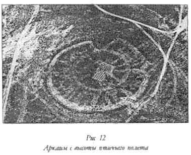 Первый снимок Аркаима с воздуха был сделан военными, нанесен, как многие подобные объекты, на карты в 1956 г. Тогда на фотоснимках были видны три кольца Аркаима. Теперь, на снимках, сделанных в 80-х годах, видно только два (рис. 12).