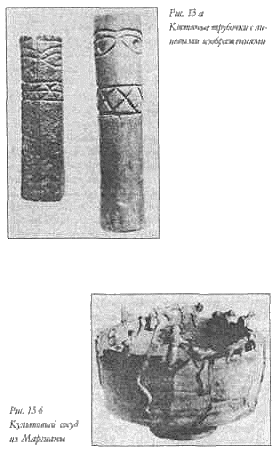Раскрывая одну загадку арийской культуры, мы неизбежно приближаемся к другой. Так, на крайнем востоке нынешнего Туркменистана, найдены остатки храма (так называемый Тоголок-2), напоминающего крепость периметром 140#215;100 м. Сегодня установлено 1, что здесь в бассейне древней дельты р. Мургаб в начале II тысячелетия до н. э. существовала страна Маргуш (Маргиана), упоминаемая в древнеиранских текстах. Слава этой об этой стране достигала территорий современных Ирана, Афганистана и Индии. Предполагается, что именно здесь находилась родина Зороастра (и его учения) — составителя Авесты. Белое пятно истории, исчезло, благодаря находкам в Туркмении, которые указывают на процветавшую здесь некогда культуру. Именно здесь встречается «арийская триада» — миниатюрные полые колонки (для культового употребления опьяняющего напитка сома-хаома, содержащего наркотический эфедрин), ритуальные сосуды со скульптурными фигурками по верху (рис. 13 а, б, в) и амулеты с композициями на тему «похищения живительной силы». Не случайно, совеменные зороастрийские общины в Индии устраивают экспедиции в юго-восточный Иран в район г. Кермана, где в изобилии произрастает эфедра ингермедиа, содержащая эфедрин.