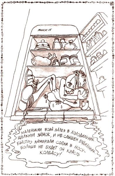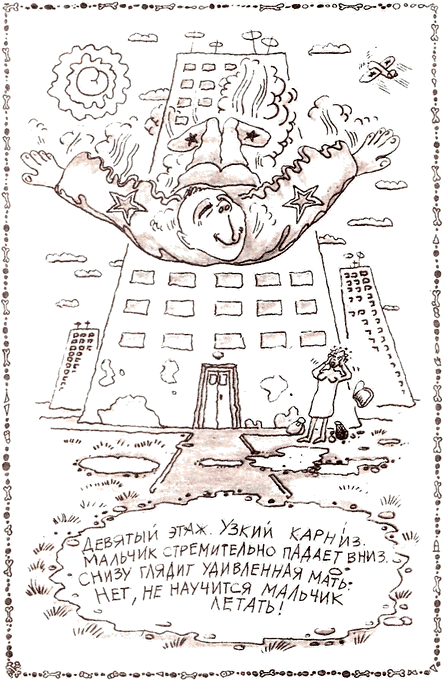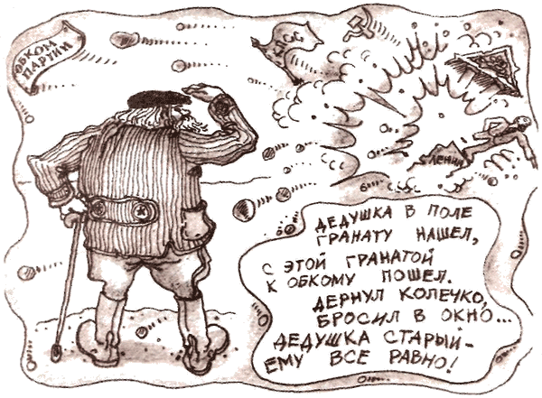 * * *Мальчик-тихоня шёл из кино.В доме напротив открылось окно.Выстрел раздался в ночной тишине -долго дымилась дыра в голове.* * *Мальчик Мишаня нашёл хлеборез,тихо в квартиру директора влез.Быстро свершилося черное дело -в ванной нашли расчлененное тело.* * *Мальчик в конверт запечатал тротил,папе на письменный стол положил…Сын на граните просил написать:«Нечего было за двойку ругать!»* * *Мальчик Володя на крыше сидел -был бы он бабочкой - он полетел.Тихо подкрался с дубинкою кто-то:вот и сбылася мечта идиота.* * *Холодно в доме. Папа в тужурке.Мама дочуркою топит в печурке.* * *Бабушка внучку очень любила,мину в постель ей она положила.Ночью два мощных раздалися взрыва -внученька бабушку тоже любила.* * *Папа-мясник старичка потрошил.Сын раздражённо ему говорил:«Деда давно надо было кончать -падаль пойдет лишь по рубль двадцать пять».* * *Папочка сына хотел отравить,просит в жаркое мышьяк положить.Официант вдруг становится строже:«Будет на двадцать копеек дороже!»* * *Маша и Миша играли на крыше.После двух выстрелов стало потише.
