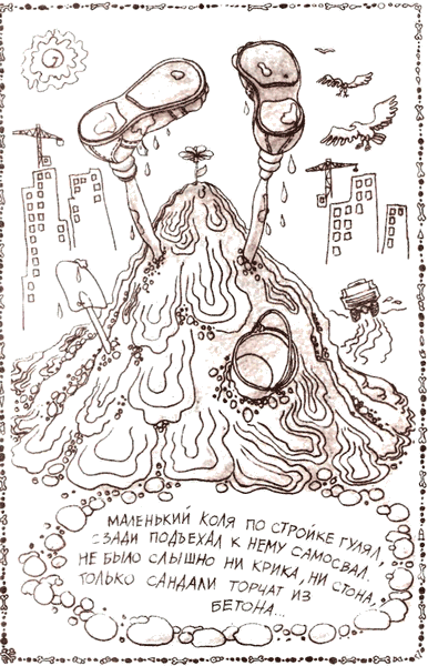 * * *Девочка Лёля бежит за трамваем,словно в «пятнашки» с трамваем играя.Вот разогнался трамвайчик предельно:ножки отдельно, головка отдельно…ИЗ СЕРИИ «ДЕТСТВО» * * *По кривой, извилистой дорожке,через лес и горы напрямикна машине ехали уроды -ехали живого хоронить.За рулем сидел у них безрукий,а безногий жал на тормоза.А слепой указывал дорогу,а дурак бибикал без конца.Вдруг из леса выскочила банда -грузовик пришлось остановить.И немой глухому что-то гаркнул,А безрукий поднял дробовик.Вот раздались выстрелы слепого -сразу пять бандитов наповал.Половина банды разбежалась,но безногий тут же их догнал.Одного бандита не приметил -спрятаться в болоте тот решил,но слепой давно его заметил,а безрукий с кольта уложил…