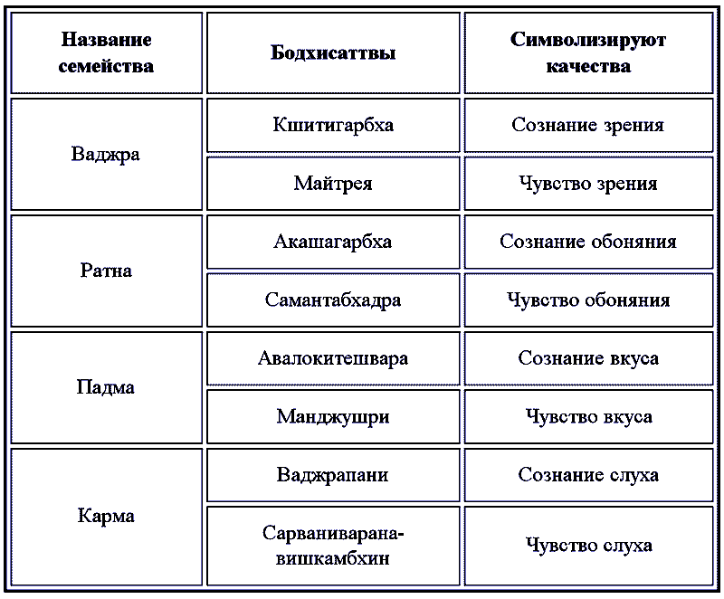Название семейства 1. Ваджра 2. Ратна 3. Падма 4. Карма Бодхисаттвы 1.Кшитигарбха 1.Майтрея 2.Акашагарбха 2.Самантабхадра 3.Авалокитешвара 3.Манджушри 4.Ваджрапани 4.Сарваниварана-Вишкамбхин Символизируют качества 1. Сознание зрения 1. Чувство зрения 2. Сознание обоняния 2. Чувство обоняния 3. Сознание вкуса 3. Чувство вкуса 4. Сознание слуха 4. Чувство слуха